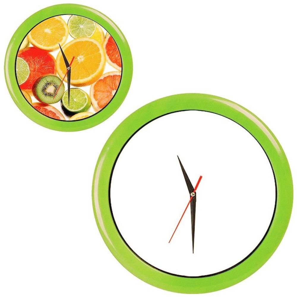 Pantone 368 C. Часы настенные с кварцевым механизмом, работают от 1 батарейки АА. Предназначены для вставки циферблата с печатью по индивидуальному дизайну Комплектация: 1) корпус с часовым механизмом, 2) минеральное стекло, 3) ободок, 4) стрелки - 3 шт. (часовая и минутная стрелки - черного цвета, секундная - красного цвета). Для удобства вставки циферблата с печатью по индивидуальному дизайну, стрелки часов не зафиксированы и поставляются в отдельном пакетике) 5) Муляж циферблата (диаметр 235 мм) Для вставки используется мелованная бумага матовая 300 гр.