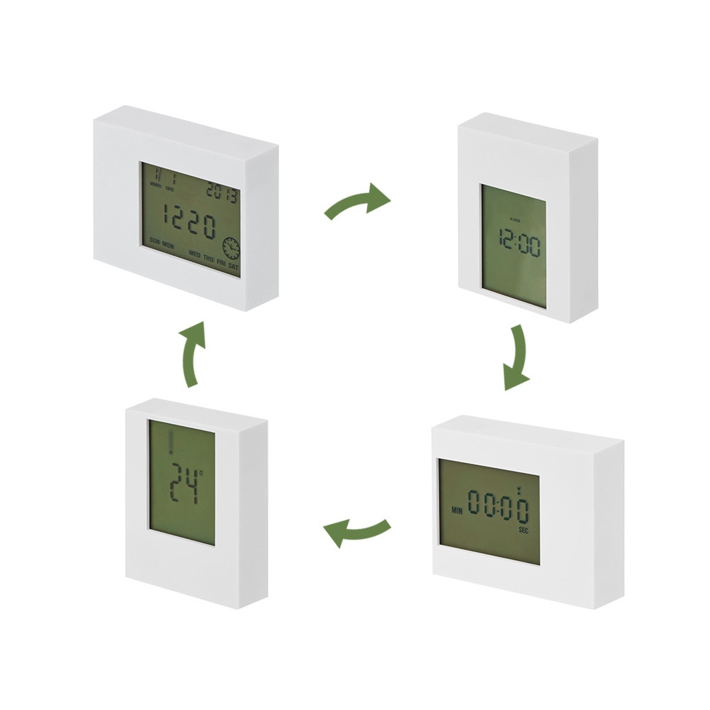 Многофункциональные настольные часы с подсветкой, которые в зависимости от положения показывают разные значения: дата и время, будильник, таймер и температура воздуха.