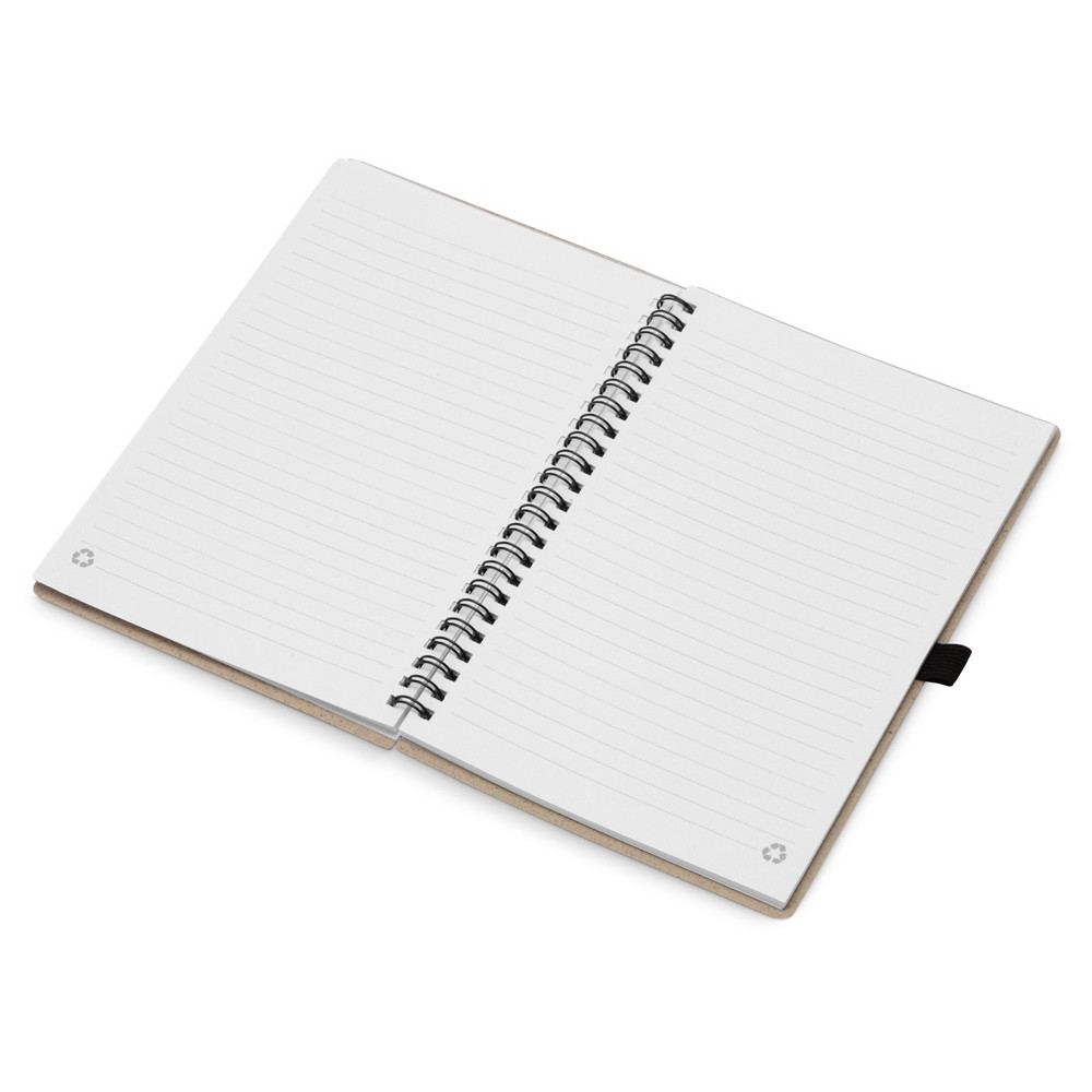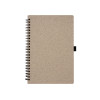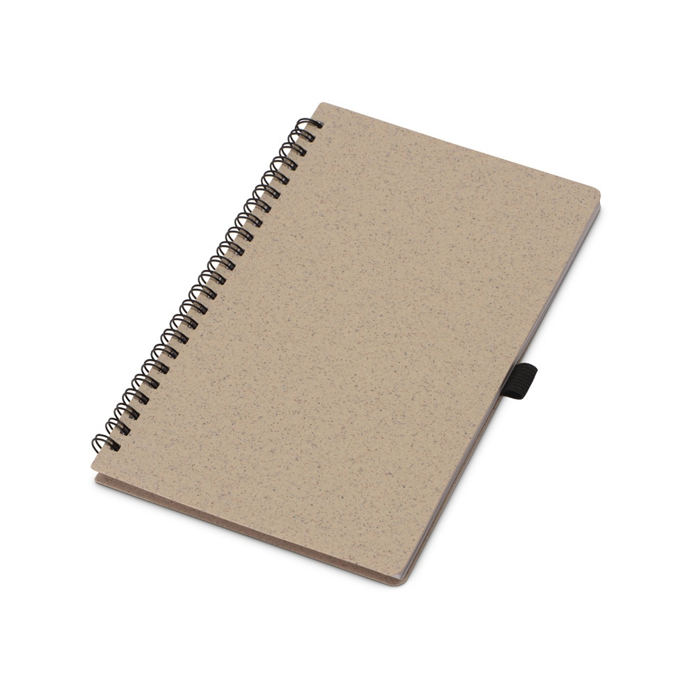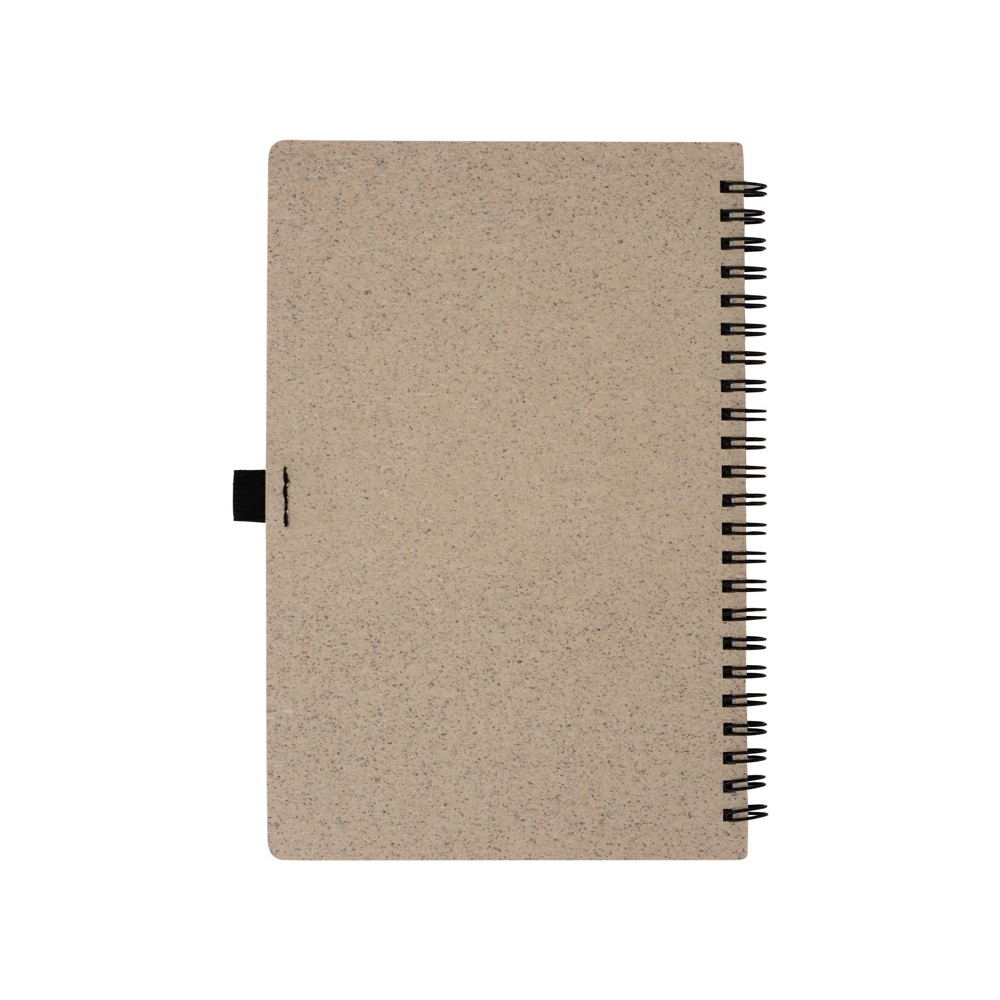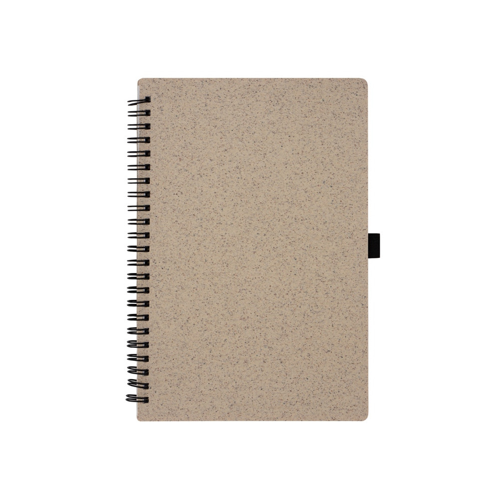 Блокнот с обложкой из переработанной пшеницы и пластика. Блок состоит из 70 листов переработанной бумаги белого цвета. Крепление - пружина. Дополнен петлей для ручки.