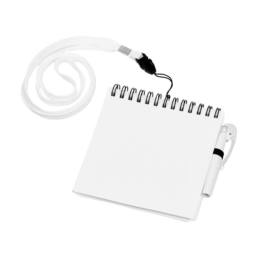 Яркий блокнот с шариковой ручкой можно носить на шее благодаря специальному ремешку (45 см). Отличный промо-сувенир, на обложку которого можно нанести логотип.