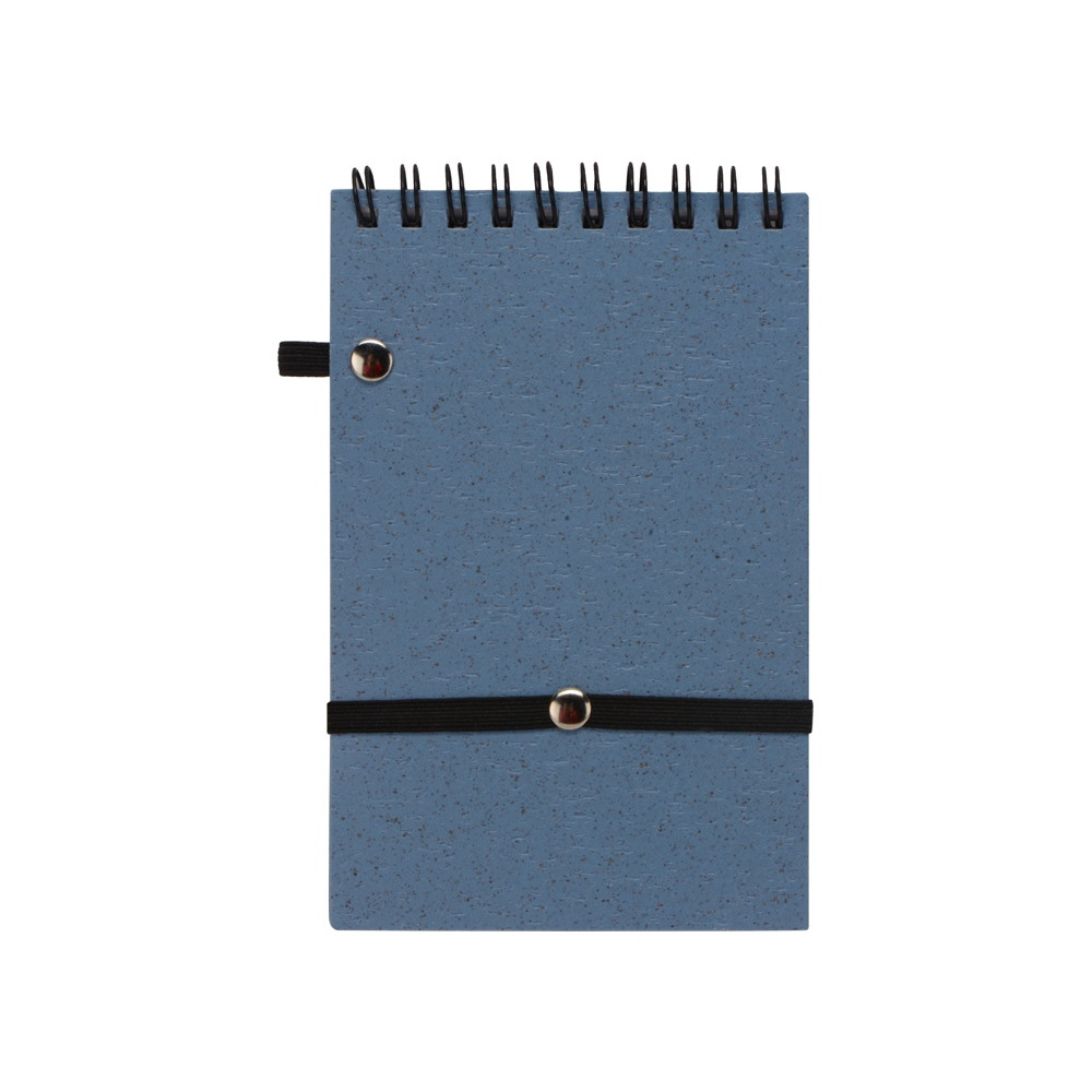 Блокнот с обложкой из переработанной пшеницы и пластика. Блок состоит из 60 листов переработанной бумаги белого цвета. Крепление - пружина. Дополнен петлей для ручки и горизонтальной резинкой.