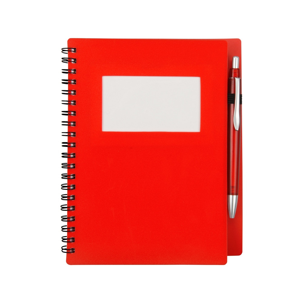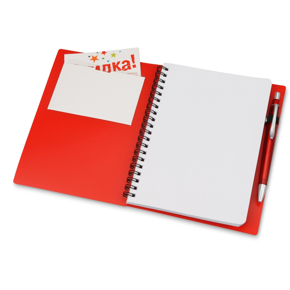 Блокнот Контакт в полипропиленовой обложке переплетен на пружине. В обложке блокнота предусмотрено окошко, в которое можно поместить визитную карточку или полиграфическую вставку. В комплекте с блокнотом идет ручка, которая вставляется в петельку сбоку.
