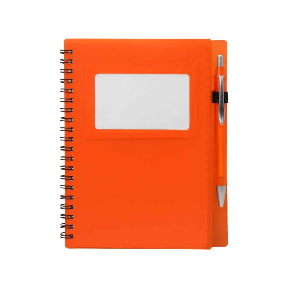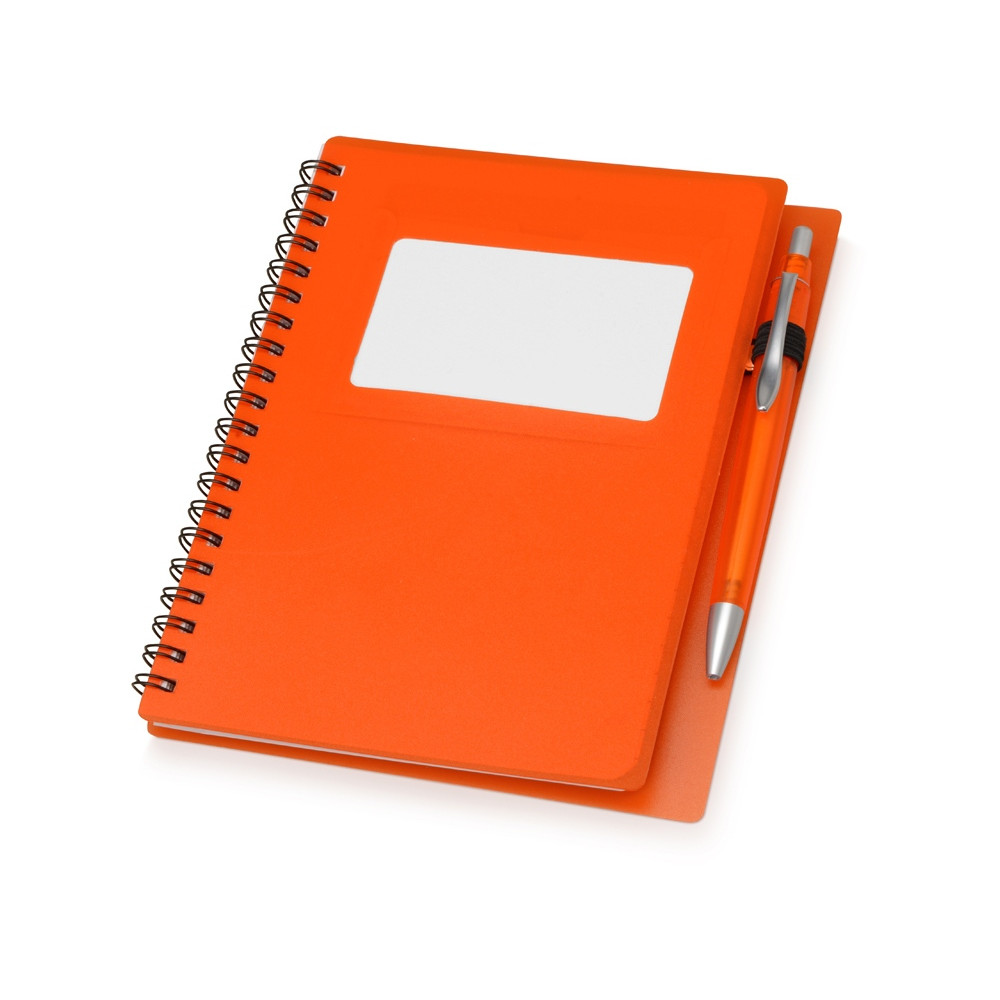 Блокнот Контакт в полипропиленовой обложке переплетен на пружине. В обложке блокнота предусмотрено окошко, в которое можно поместить визитную карточку или полиграфическую вставку. В комплекте с блокнотом идет ручка, которая вставляется в петельку сбоку.