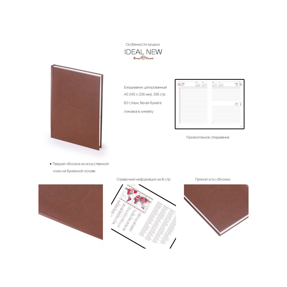 Датированный ежедневник IDEAL NEW. Блок содержит 336 страниц белой бумаги плотностью 60 г/кв.м. Обложка - классический итальянский переплетный материал на бумажной основе ,устойчивый к истиранию. Справочная информация на 16 страницах.