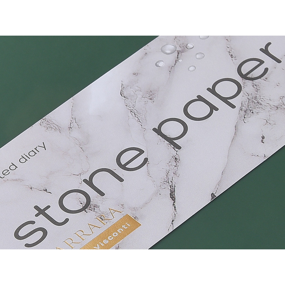 Уникальность недатированного ежедневника Carrara от Bruno Visconti — в его блоке. Он изготовлен из каменной бумаги плотностью 144 г/кв.м, отличающейся особой гладкостью и повышенной прочностью. Она не боится воды и пролитого кофе, достаточно просто протереть сухой салфеткой.