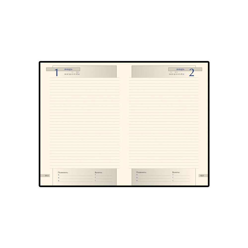 В ежедневнике есть полезная справочная информация и телефонная книга, а также 416 страниц для записи идей, мыслей и составления рабочих планов. Для изготовления страниц используется качественный бежевый офсет повышенной плотности (70 г/кв м), которая производится японской фирмой Daiwa и подходит для всех видов чернил.