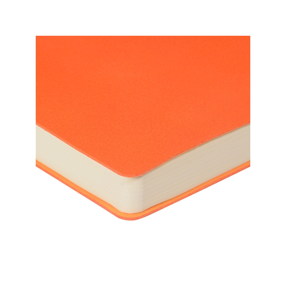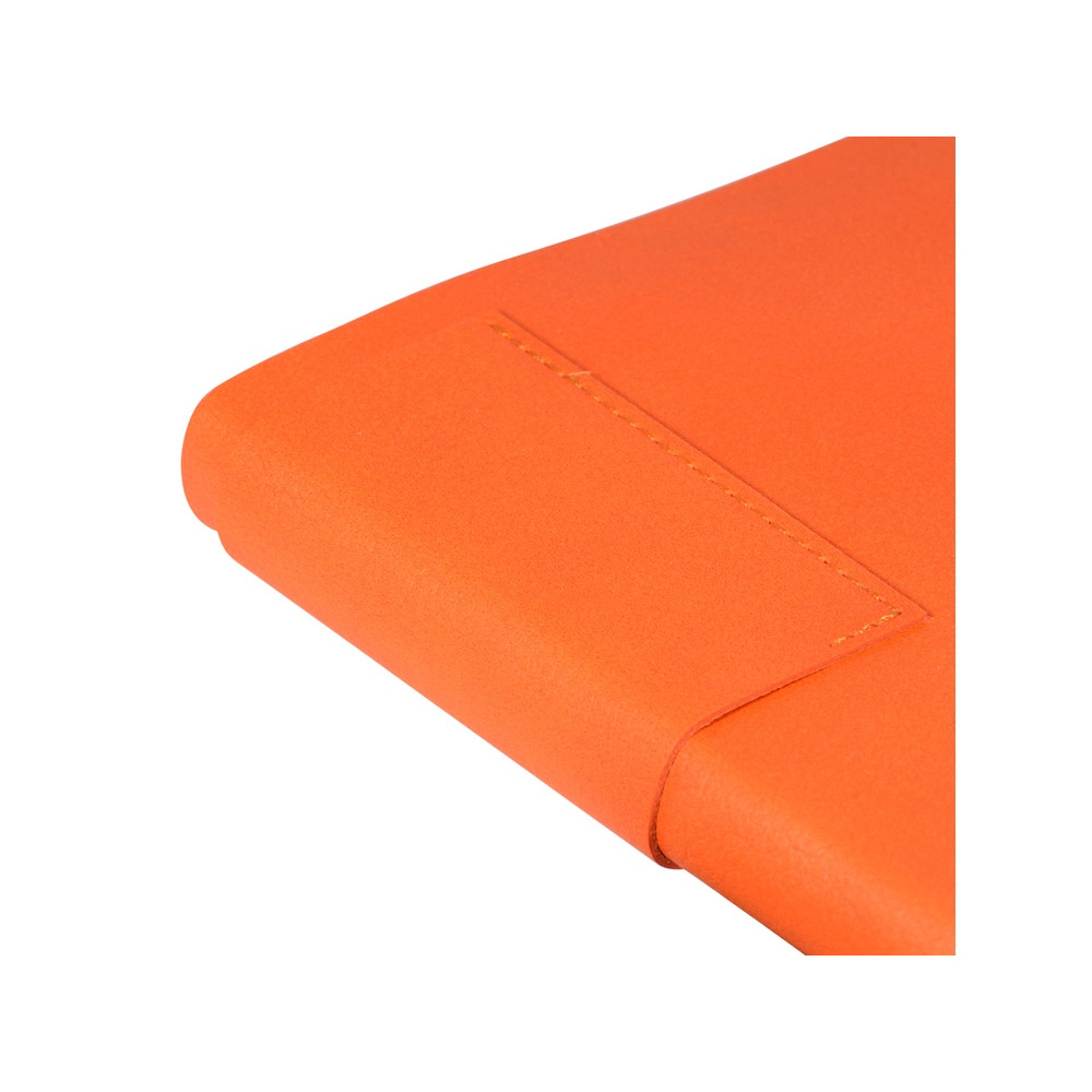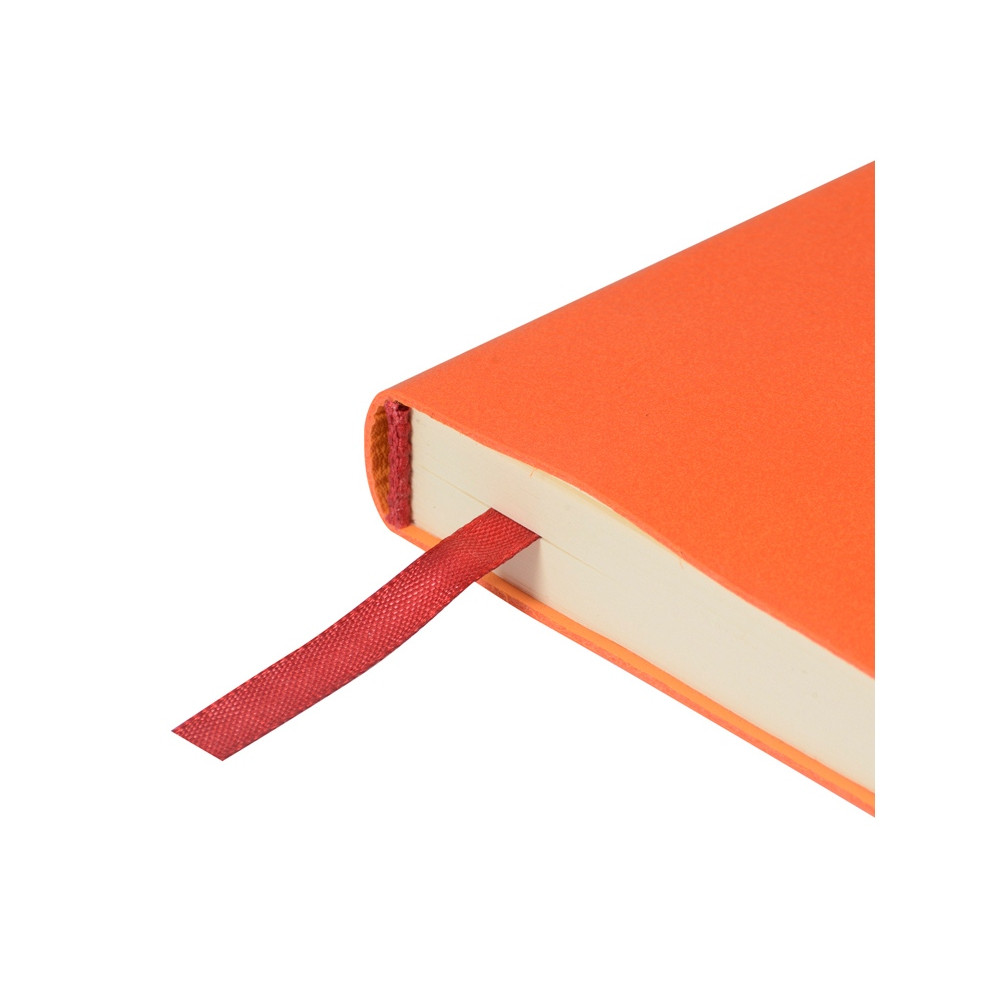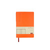 Лаконичная модель в ярком исполнении: гибкая обложка оранжевого цвета с контрастной или в цвет обложки нашивкой. Выполнен из качественной и прочной искусственной кожи, крепление внутреннего блока - книжный переплет, закладка- ляссе. Углы обложки скруглены.