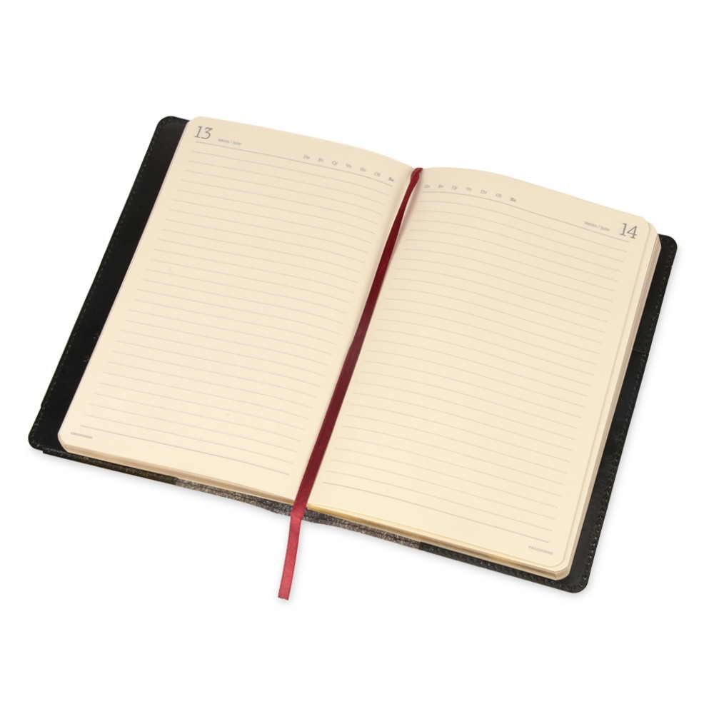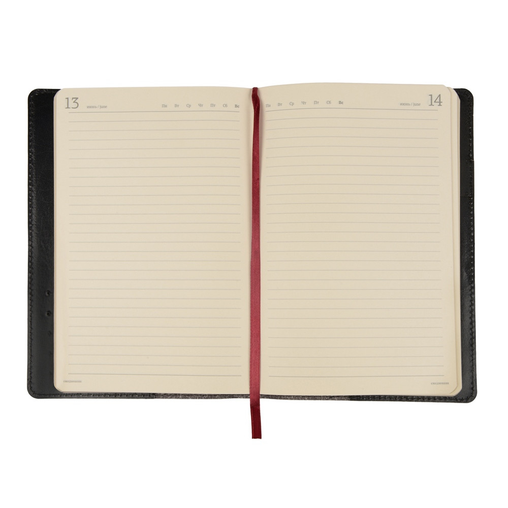 Ежедневник формата А5 выпускается размером 143*216 мм. Полудатированный сменный блок включает 416 страниц бежевого цвета.