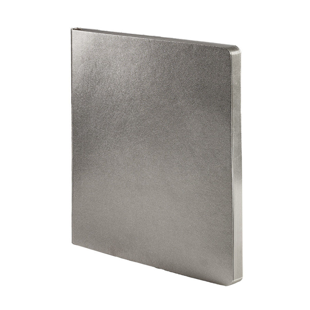 Бизнес-блокнот AURI в серебристом исполнении — сочетание современного делового стиля и премиального дизайна. Мягкий переплёт из нетермоактивного PU‑материала приятен на ощупь и визуально напоминает слиток благородного металла. Серебристый обрез страниц подчеркивает минималистичный образ, превращая рабочий инструмент в статусный аксессуар.Основные характеристики:Формат: 145×205 ммПереплёт: мягкий, из нетермоактивного PU‑материалаОбрез: серебристый, матовыйБлок: 256 страниц, кремовая эвкалиптовая бумага, плотность 70 г м²Разлиновка: клеткаУглы: скруглённыеЛяссе: ширина 7 ммДополнительно: перфорация на последних страницахУпаковка: черный сливбокс из переработанного картона+ бумагаВнутренний блок обеспечивает комфортное письмо и приятный визуальный контраст с серебристой обложкой. Упаковка защищает изделие при транспортировке и подчёркивает ответственное отношение к экологии.