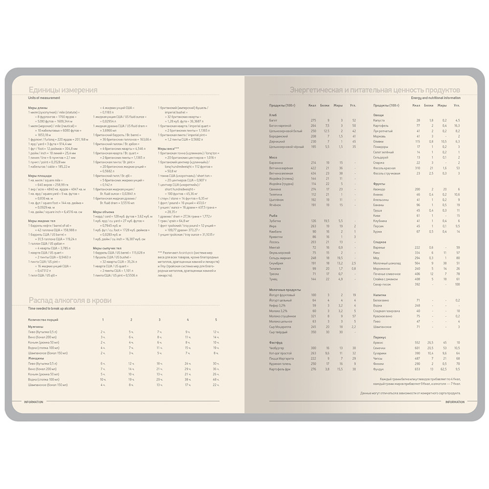 Недатированные страницы в серую линейку имеют отдельное место для проставления числа месяца и дня недели. Справочный блок на 17 страницах содержит полезную информацию из различных областей.
