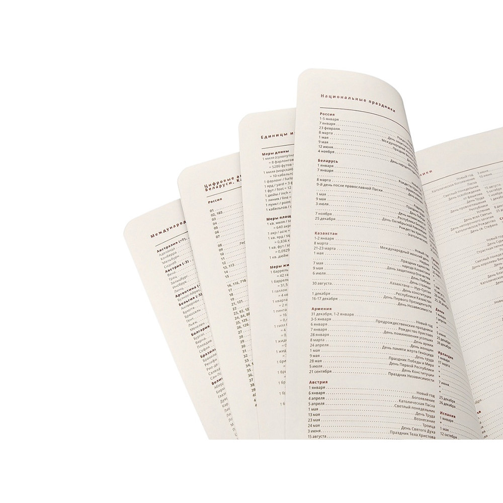 - раздел справочной информации на 17 страницах (часовые пояса, аэропорты Европы, международные телефонные коды, размер одежды, телефонные коды России, Беларуси, Казахстана, Армении, цифровые автомобильные коды, римские цифры, расход калорий при физической нагрузке, формат бумаги, десятичные приставки, единицы измерения, греческие буквы, штрихкоды, время распада алкоголя в крови, города-миллионники, национальные праздники, термины международной торговли, температура, скорость, давление, буквенные коды стран, энергетическая и питательная ценность продуктов, страны мира, заметки);