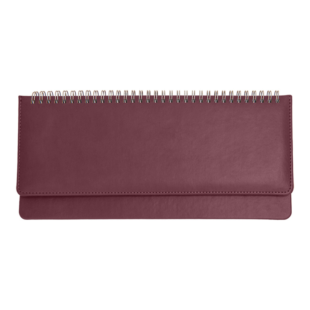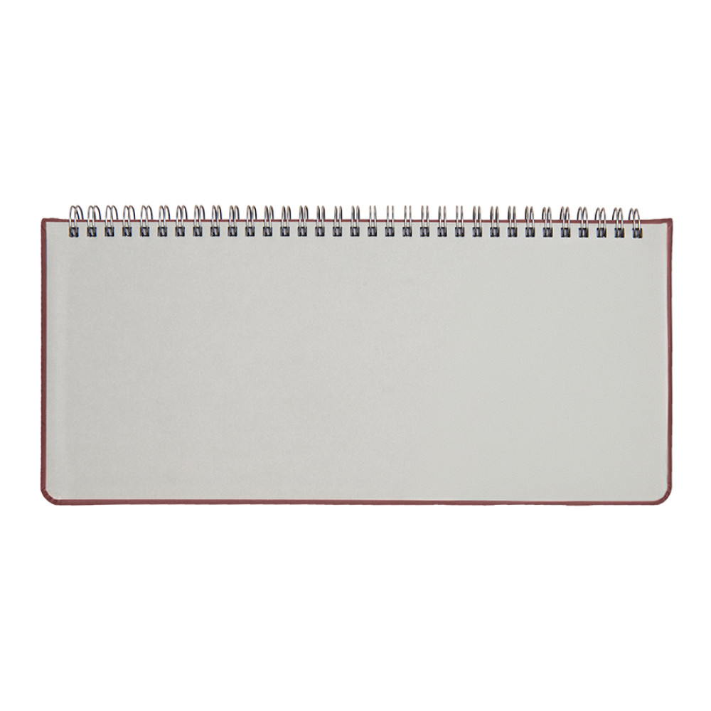 Цвет обложки, близкий к пантону 491C Размер 140*300 мм Переплет твердый, на металлической спирали, прошивка по периметру верхней обложки Обложка PU Velvet Блок недатированный, в линейку, прямые углы Бумага белая, плотность 70 г м2 Форзац нахзац серые 128 страниц Упаковка крафтовый сливбоксВ данный момент происходит смена справочной части блока. Внешний вид изделия остается без изменений.