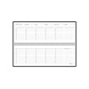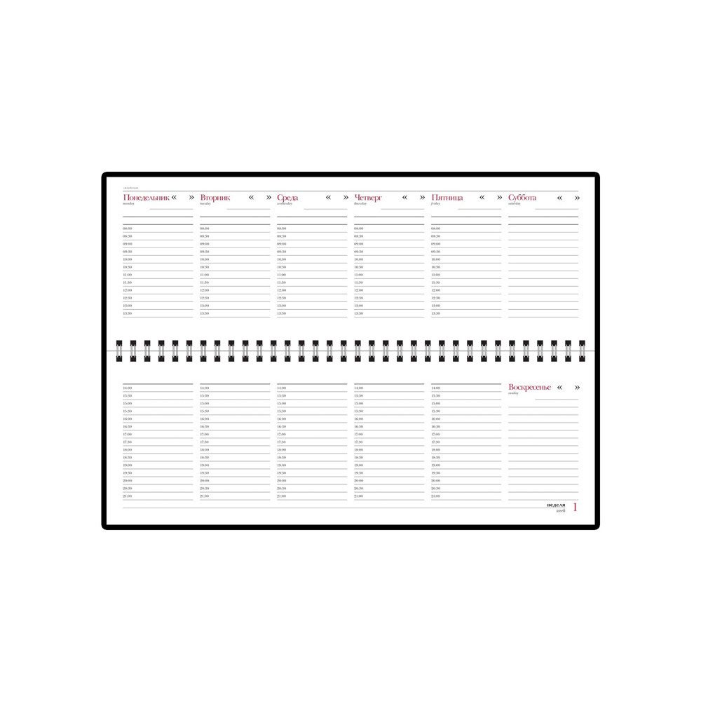 Недатированный планинг выпускается размером 305*130 мм и содержит 128 страниц (блок 292 х100 мм). Для них выбрана высококачественная белая бумага плотностью 70 грамм. Разворот представляет собой разметку на 7 дней недели с графами с указанием времени. Месяц и день недели указаны на русском и английском языках. Первые 15 страниц содержат справочные сведения из различных областей на русском языке. Крепление листов на открытом гребне способствует быстрому переходу по страницам.