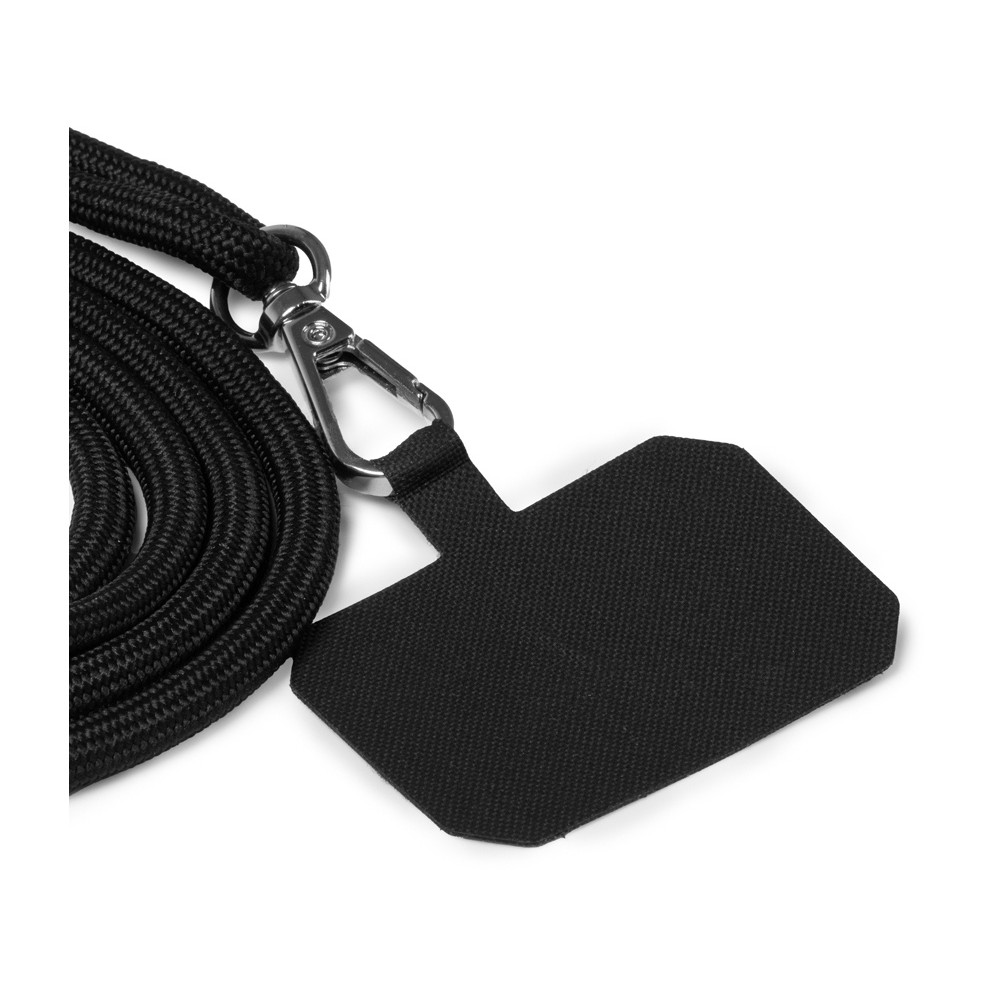 Держатель для мобильного телефона на шнурке из переработанного полиэстера RPET. Регулируемый ремешок, в комплект входит карабин.