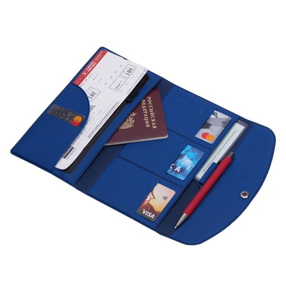Органайзер для документов на кнопке с отделением для купюр и ручки, упаковка в индивидуальный пакет, синий/темно-синий