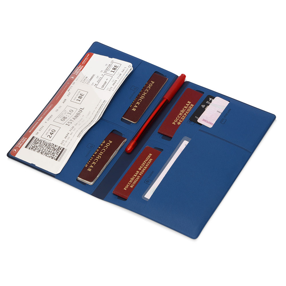 Внутри имеется восемь карманов, которые позволяют вместить документы для семьи из четырех человек. Документы аккуратно разложены и не утратят свою форму. Благодаря своим преимуществам органайзер для путешествий становится не только отменным подарком, но и эффективным рекламным средством.
