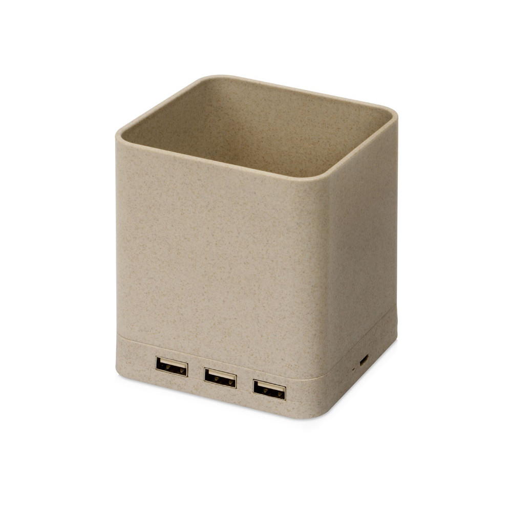 Отличный гаджет для работы или дома, сочетающий в себе подставку для ручек и других мелочей, встроенное отделение для беспроводной зарядки устройств, а также USB-хаб на 3 порта. Модуль беспроводной зарядки может также использоваться как подставка для телефона. Хаб удобен для подключения дополнительных устройств к компьютеру или одновременной проводной зарядки ваших гаджетов. Большое пространство для нанесения делает этот товар особенно эффективным инструментом продвижения. Корпус на 50% изготовлен из переработанной пшеничной соломы и на 50% из АБС-пластика.