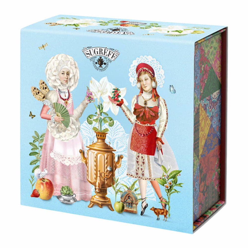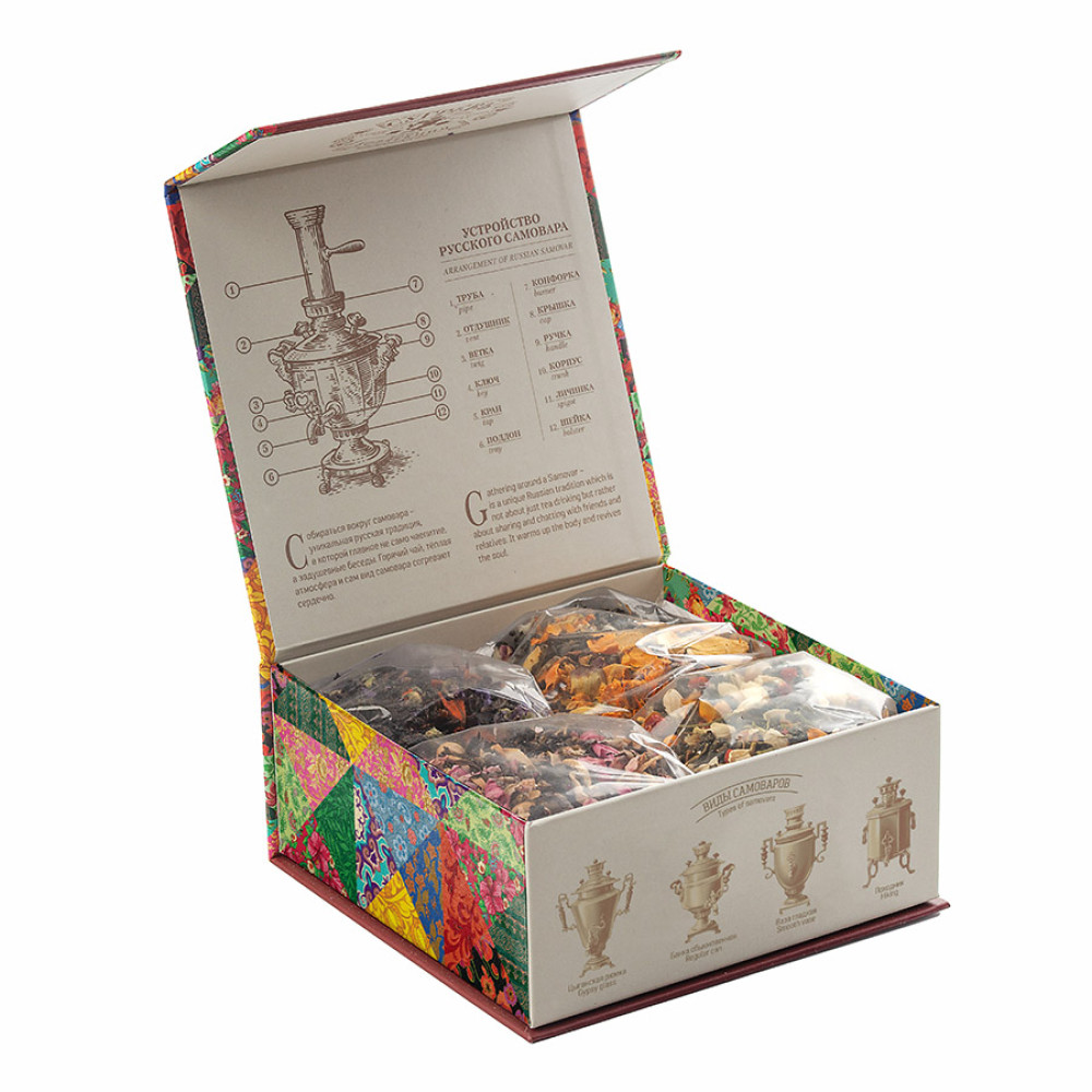 Состав чая:1. Чай зеленый китайский, купальница, цветки яблони, ароматизатор. 2. Тегуань инь, цветы акации, цветы жасмина, ароматизатор. 3. Чай черный индийский, цветы лилии, мальва, ароматизатор 4. Чай черный индийский, цветы персика, цветки апельсинового дерева, ароматизатор.Вес одного пакета чая: 40 гр.