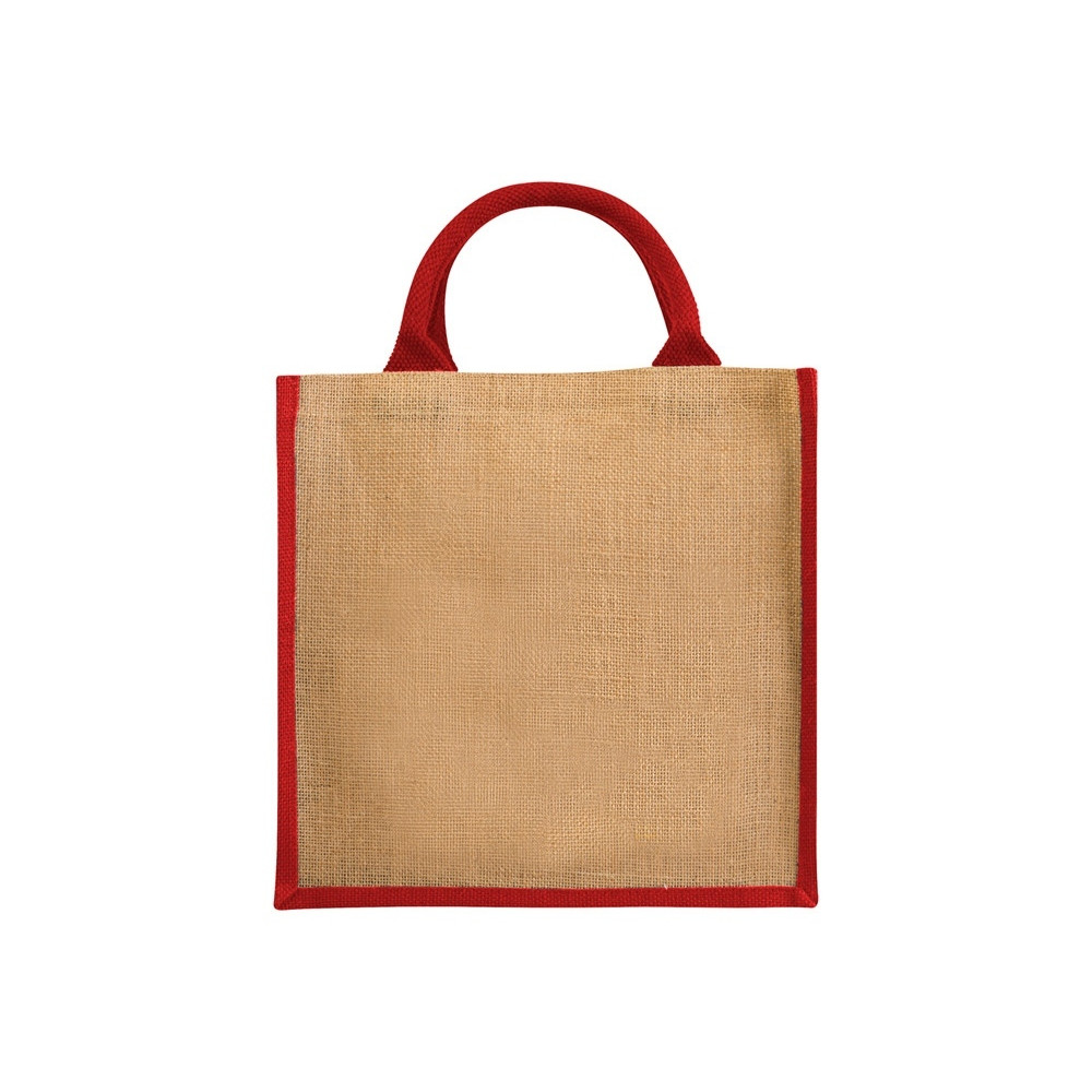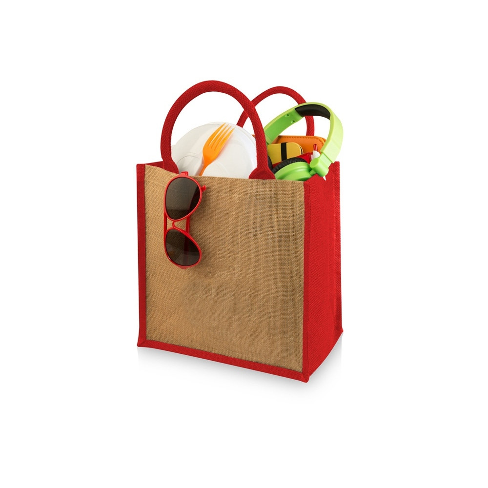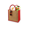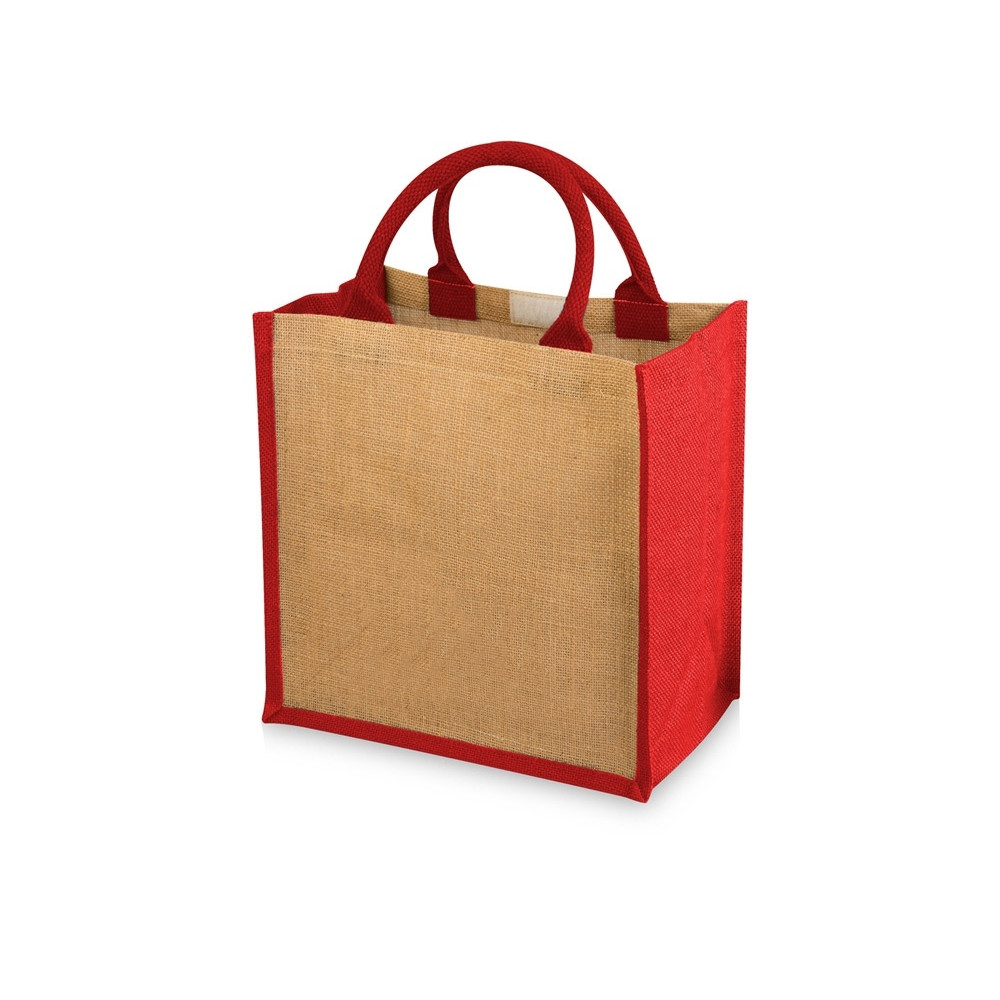 Джутовая подарочная сумка с ламинированным открытым основным отделением, которое застегивается на липучку. Хлопковые ручки высотой 11,5 см.