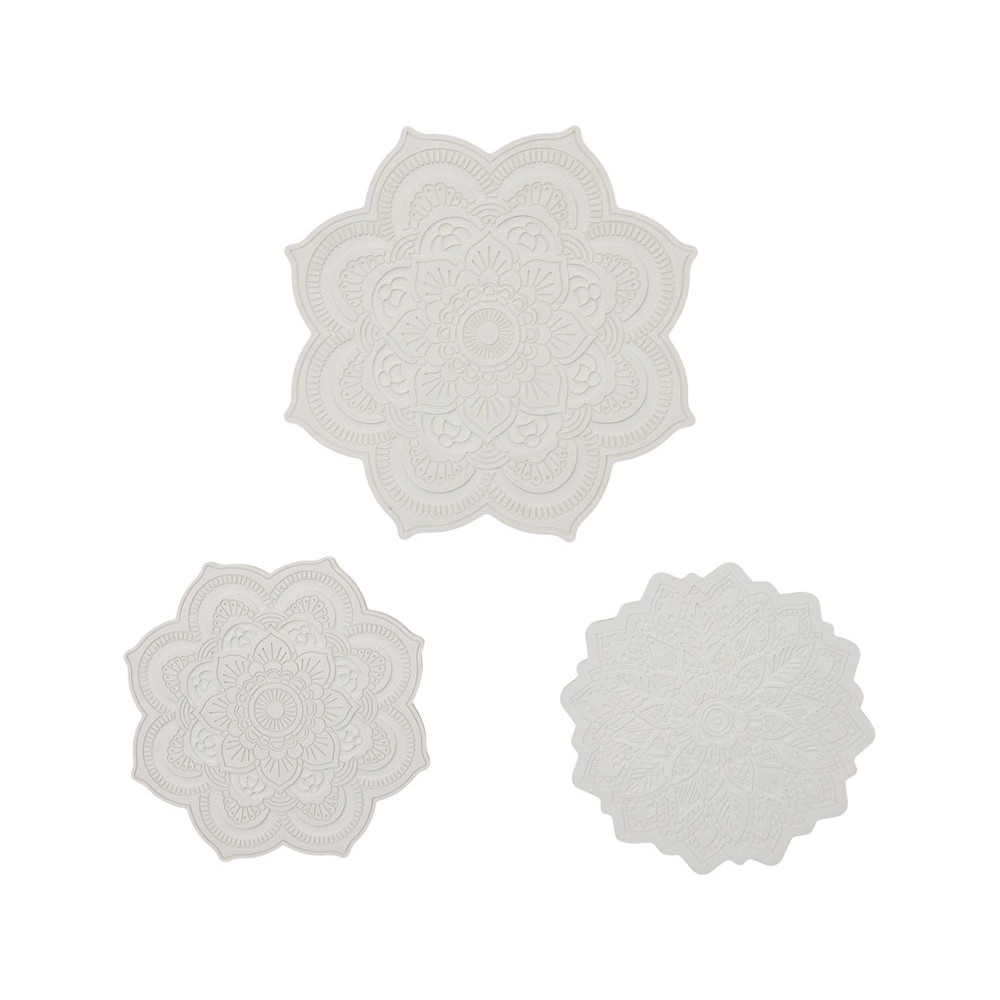 В набор входят три гипсовых фигурки мандал, а также акварельные краски и 2 кисти - более тонкая для прокраски самых тонкие деталей и чуть более толстая.