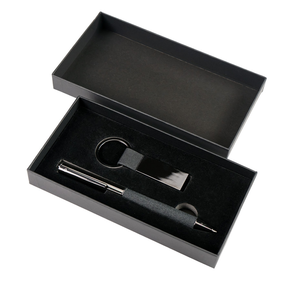 Очень стильный набор: ручка из переработанного алюминия и брелок для ключей. Металл цвета GUN с зеркальным эффектом. Отделка: высококачественная ткань из RPET, цвет серый, матовый. Упаковка коробка из дизайнерского картона.