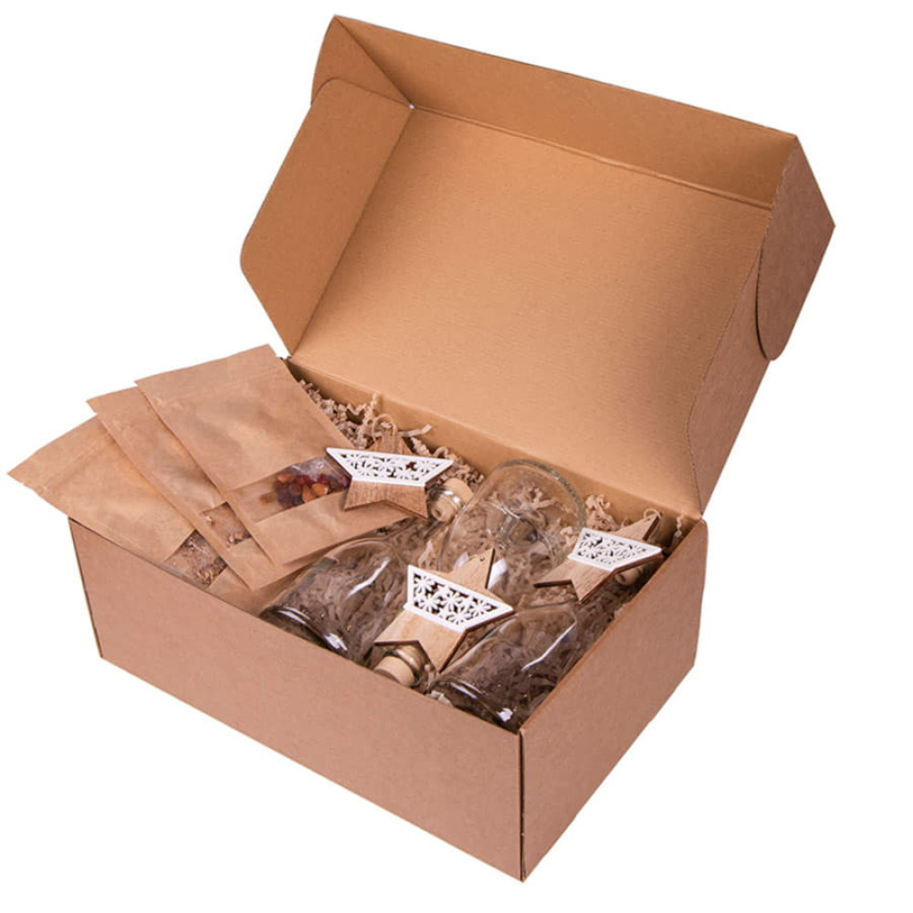 В состав набора арт. 39477 входят:- стружка- коробка подарочная арт. 34931, размер 40 х 25 х 15 см- три стеклянные бутылки объемом 0,5 литра- три полимерные пробки- три сбора для приготовления ликеров. Коньяк по- Латгальски напоминает вкус элитного, выдержанного годами коньяка. Особенное отличие напитка – это получение такого же вкуса за короткое время, как и у коньяка при длительном настаивании. Дорогие ёмкости заменяет дубовые кубики, а для придания вкусового сходства используют специи. Состав: Гвоздика, кора дуба, кардамон, дубовые кубики, мускатный орех молотый, ванилин, изюм. Вишня на коньяке - это домашняя настойка, которая имеет красивый рубиновый цвет и нежный вишнёвый вкус. Состав: Вишня вяленая, дубовые кубики средней обжарки (Кавказ), корица, миндаль, изюм, гвоздика, плоды шиповника. Миндальный коньяк обладает терпким вкусом с долгим послевкусием вишни. Дубовые кубики средней обжарки облагораживают настойку и придают нотки выдержанного элитного алкоголя.
