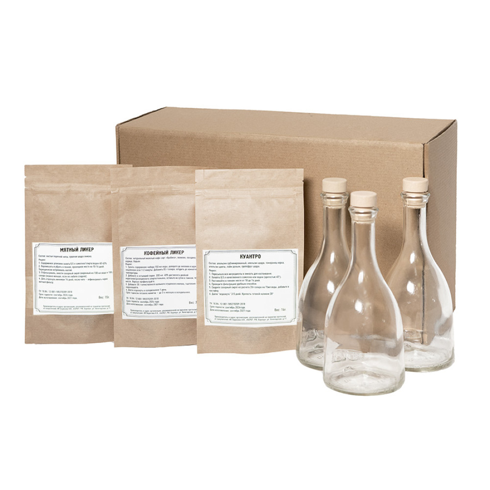 В состав набора арт. 39476 входят: - стружка- коробка подарочная арт. 34931, размер 40 х 25 х 15 см- три стеклянные бутылки объемом 0,5 литра- три полимерные пробки- три сбора для приготовления ликеров.