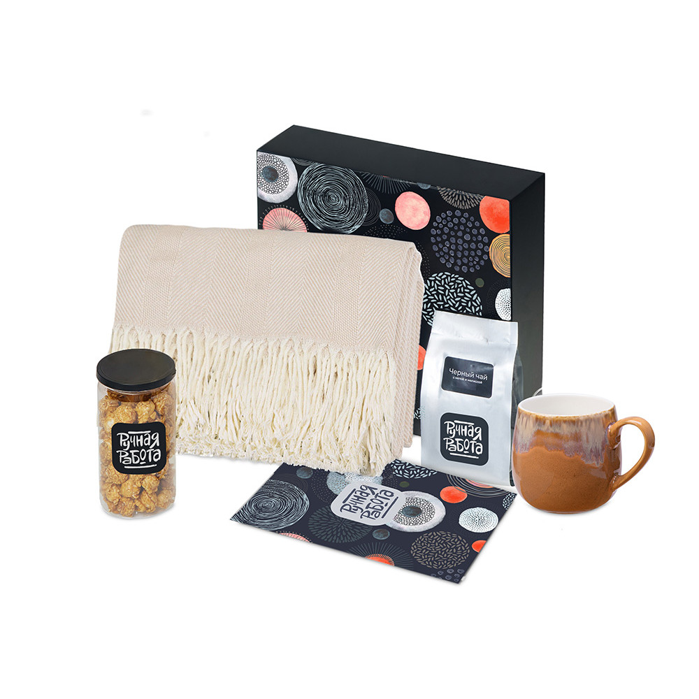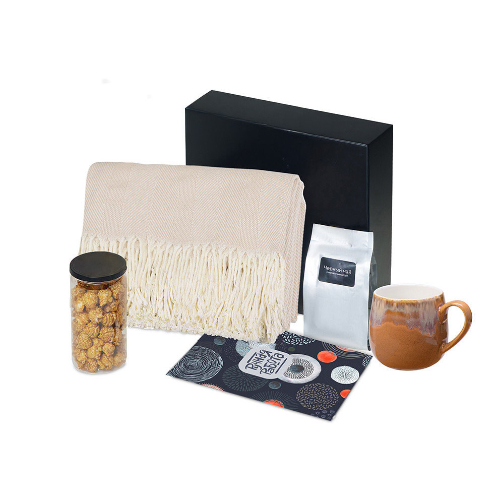 | Материал товара | плед - 100% хлопок, кружка - костяной фарфор с покрытием софт-тач, чай - пластик, попкорн - пластик, металл, мешок - нетканый материал (спанбонд), коробка - картон |
