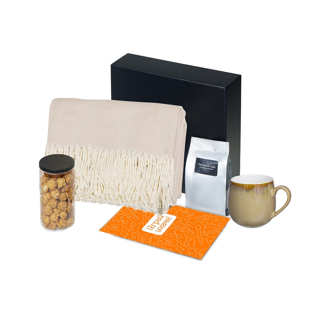 | Материал товара | плед - 100% хлопок, кружка - костяной фарфор с покрытием софт-тач, чай - пластик, попкорн - пластик, металл, мешок - нетканый материал (спанбонд), коробка - картон |