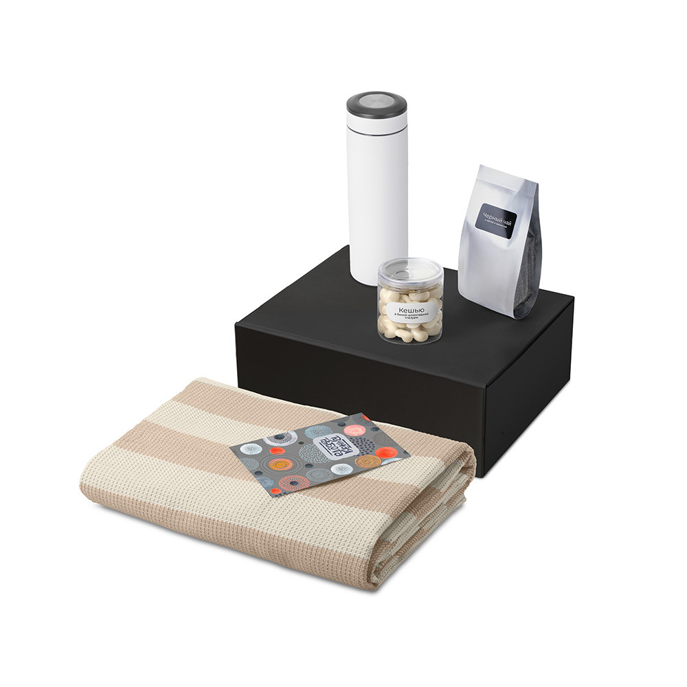 | Материал товара | плед - 100% хлопок, термос - нержавеющая сталь с покрытием софт-тач, чай - пластик, мешок - нетканый материал (спанбонд), коробка - картон |