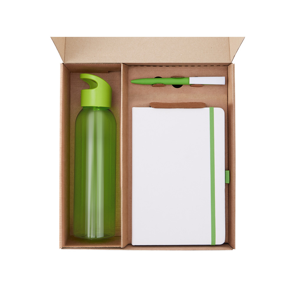 Подарочный набор с бутылкой для воды. блокнотом, ручкой и ланчбоксом, зеленое яблоко