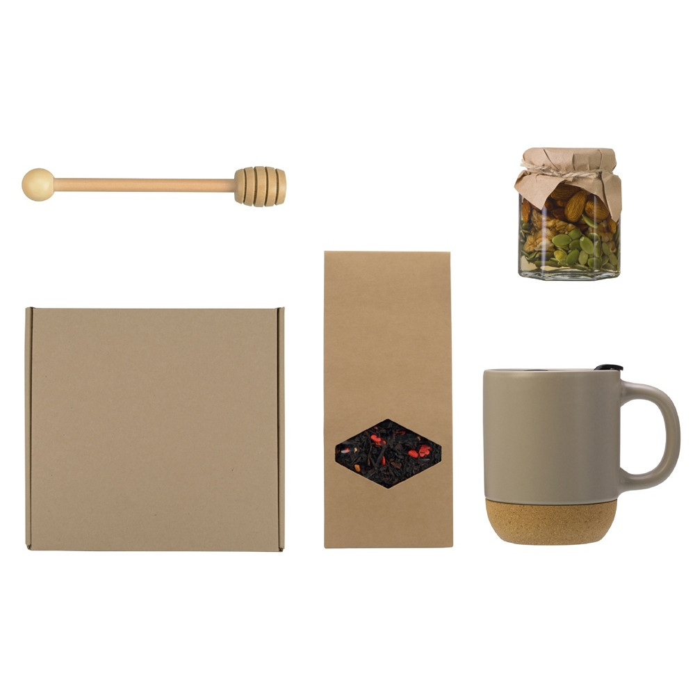 | Материал товара | кружка - керамика, пробка, мед в банке - стекло, ложка - бамбук, чай - крафт-коробка, коробка - картон |