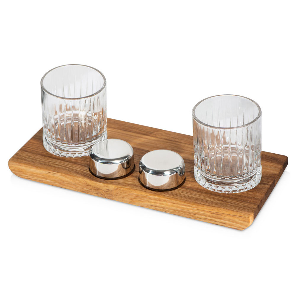 Набор Master of Wine состоит из дубовой подставки для сета, двух бокалов для крепких напитков и двух шайб из нержавеющей стали. Весь набор упакован в картонную фирменную коробку бренда — можно смело дарить!