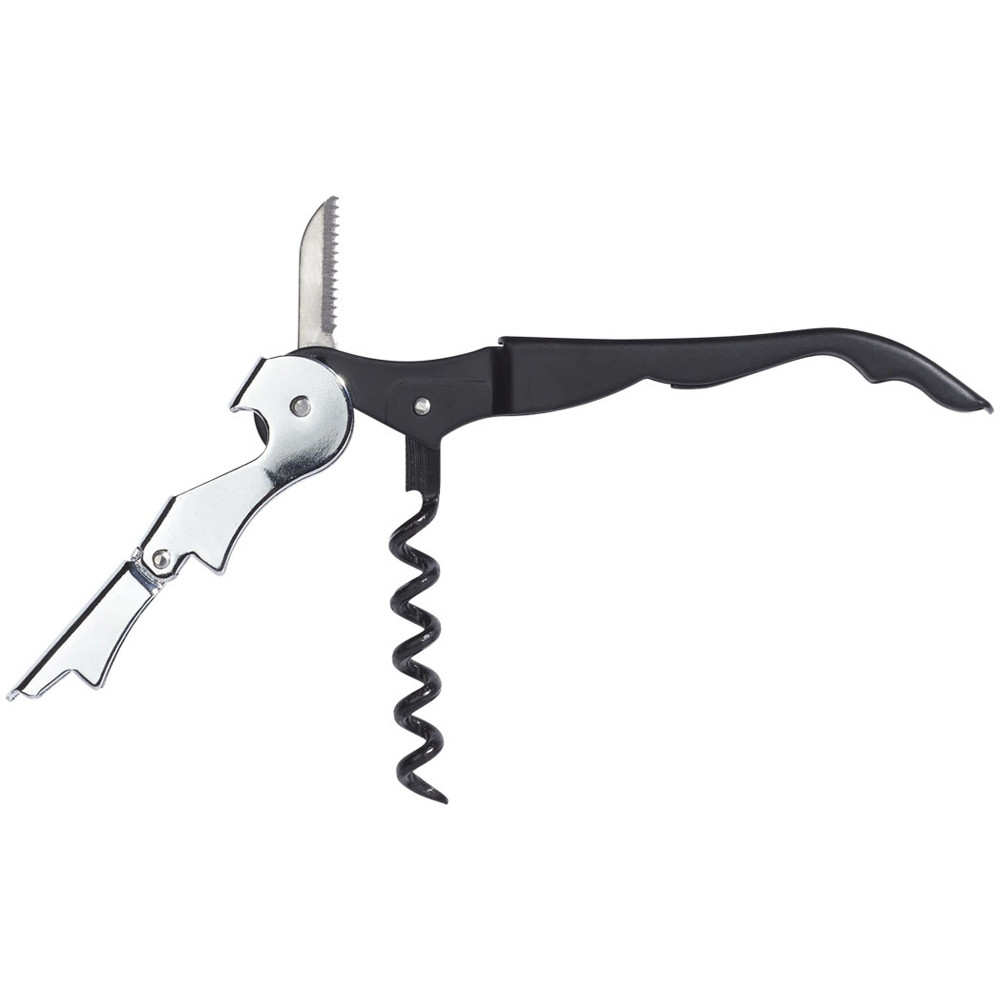 Штопор с буравчиком, открывалкой для бутылок и ножом для срезания фольги. Нержавеющая сталь.