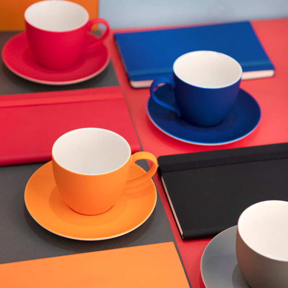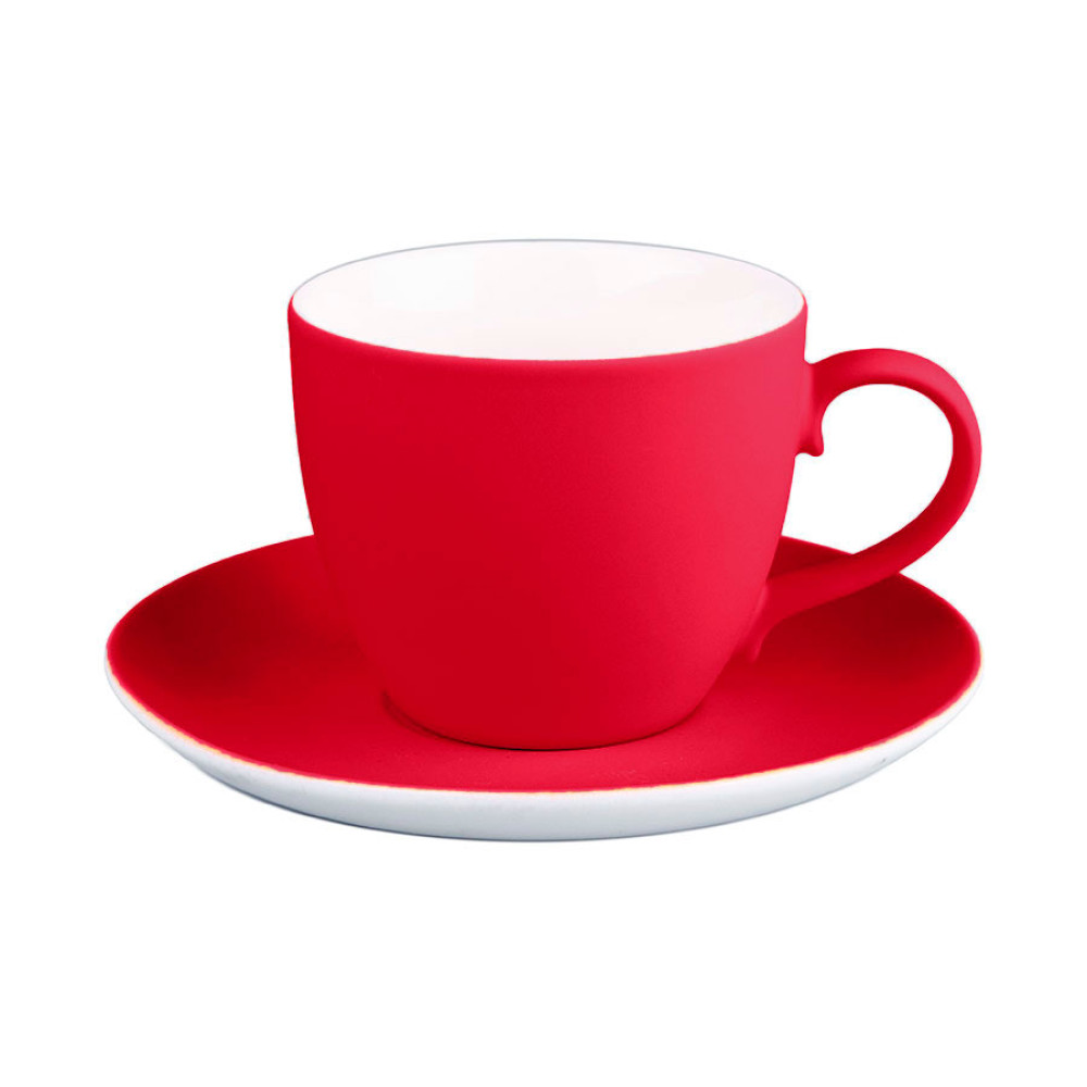 Чайная пара из фарфора с прорезиненным покрытием soft-touchЧашка классической формы и удобное глубокое блюдцеЦвет близкий к Pantone 200C