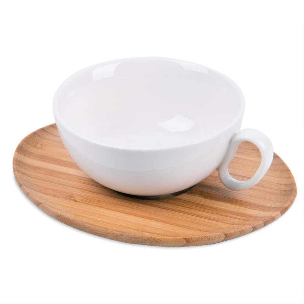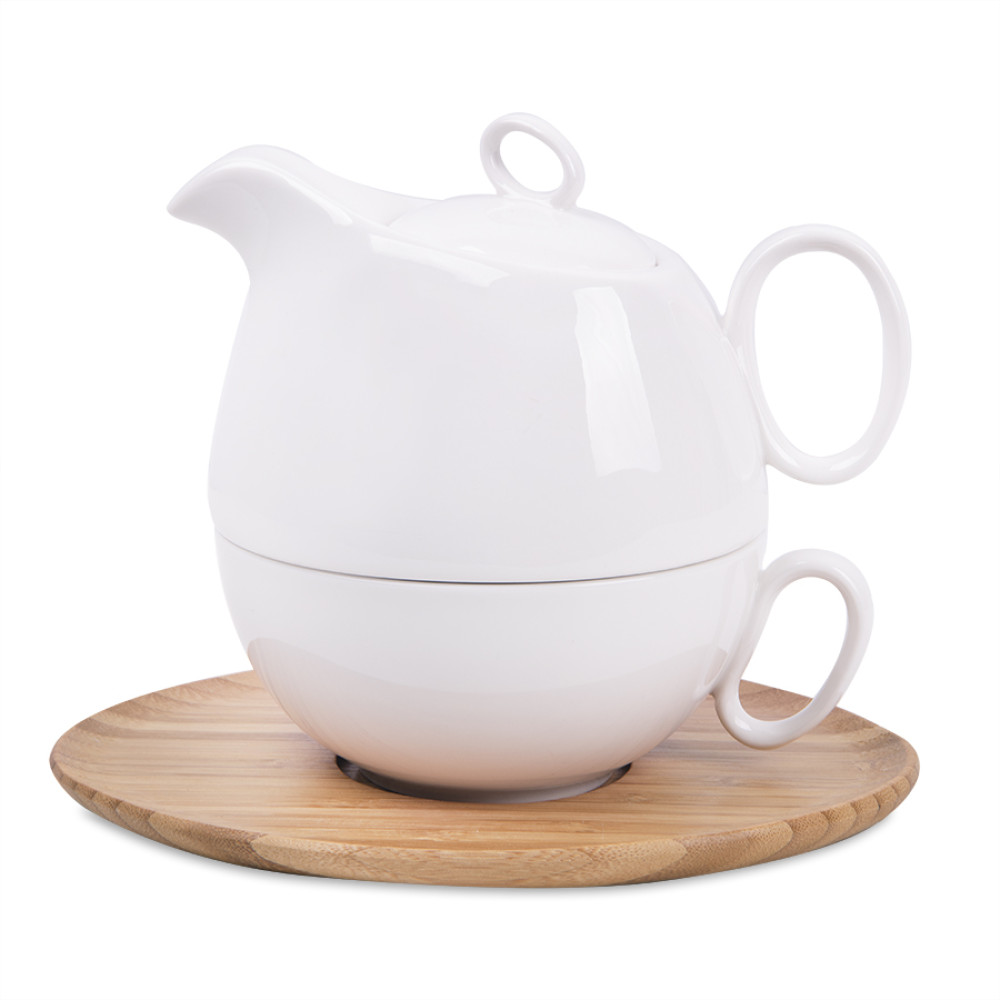 Необычный набор из фарфорового чайника и чашки на бамбуковой подставке-блюдце составит отличную теплую компанию истинным эстетам и эгоистам – разумеется, в хорошем смысле этого слова! Секрет этой пары в том, что чайник можно поставить на чашку сверху. Это позволяет и сэкономить место в кухонном шкафу или на рабочем столе, и сохранить температуру горячего чая или кофе как в чайнике, так и в слегка неполной чашке. Широкое блюдце не скользит и не царапает даже самую хрупкую поверхность, а оригинальный дизайн с удобными ручками-петельками впишутся в любой интерьер. Гармония элегантного фарфора и теплого и гладкого бамбука придаст особое очарование каждому чаепитию, придаст спокойствия и уверенности. Истинное удовольствие для настоящих интровертов! Осталось добавить только логотип – и индивидуальный подарок готов! Поставляется в упаковке.