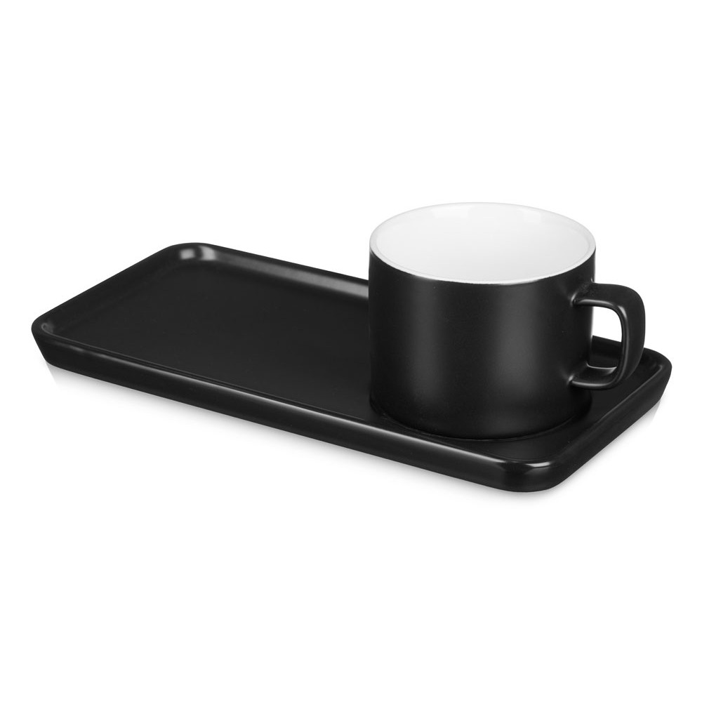 Чайная пара с необычным прямоугольным блюдцем — на нем хватит места не только для чашки, но и для пирожного. Весь силуэт этого комплекта — лаконичный, строгий, прямоугольный, что создает прекрасный фон для нанесения логотипа. Удобство этой чайной пары еще и в том, что для чашки предусмотрена отдельная ниша, которая не даст ей соскользнуть.