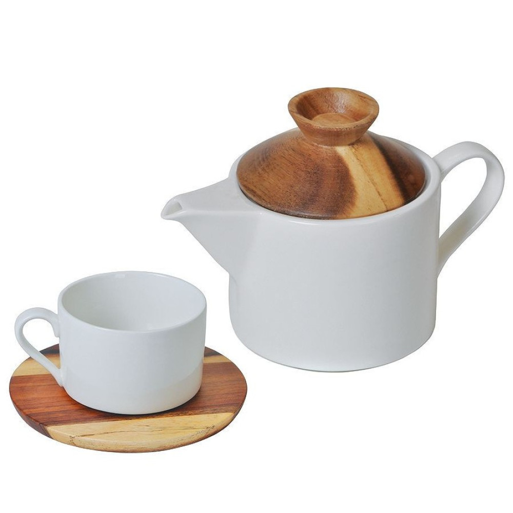 Если у Джорджа Мартина «Песнь льда и пламени», то набор ANDREW – настоящая песнь дерева и фарфора! В наборе два предмета – чайник на 600 мл и чайная пара на 200 мл. Крышечка чайника и подставка для чашки выполнены из акации, которая отличается особой прочностью и плотностью и поэтому не разбухнет от воды и влаги.Белый фарфор идеально сочетается с деревянными элементами. Только посмотрите на это великолепное стильное сочетание нежного молочного фарфора с пестрой текстурой дерева!Рисунок на срезе не повторяется, что делает каждый набор неповторимым и индивидуальным.Классное решение для маленьких кофеен, авторских ресторанов, летних веранд и коворкингов. Поставляется без подарочной упаковки.
