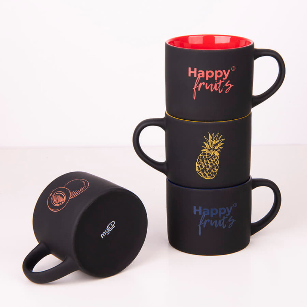 Кружка трендовой цилиндрической формы с черным прорезиненным покрытием.При гравировке подложка вскрывается в цвет внутренней части кружкиЦвет внутренней части близкий к Pantone 368C
