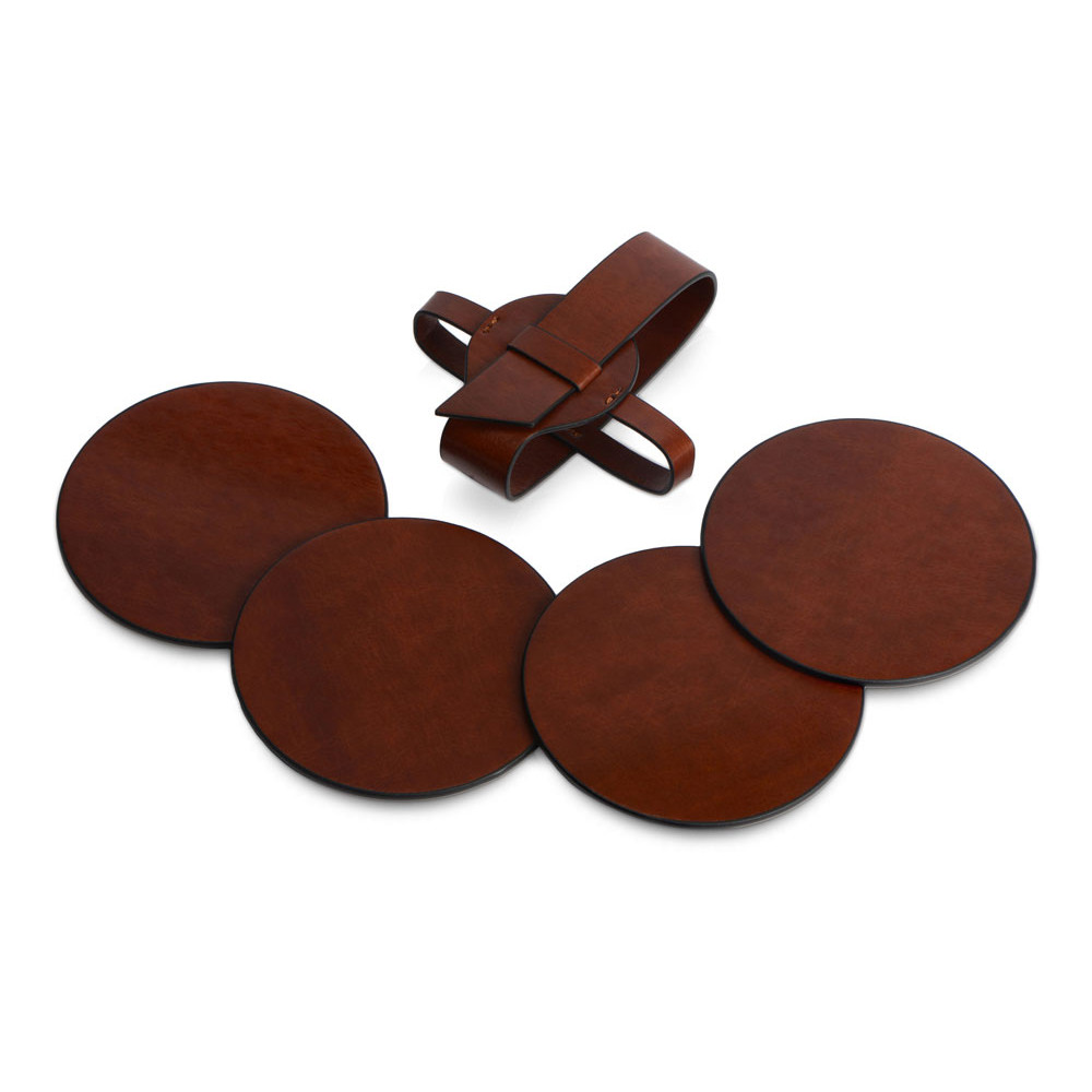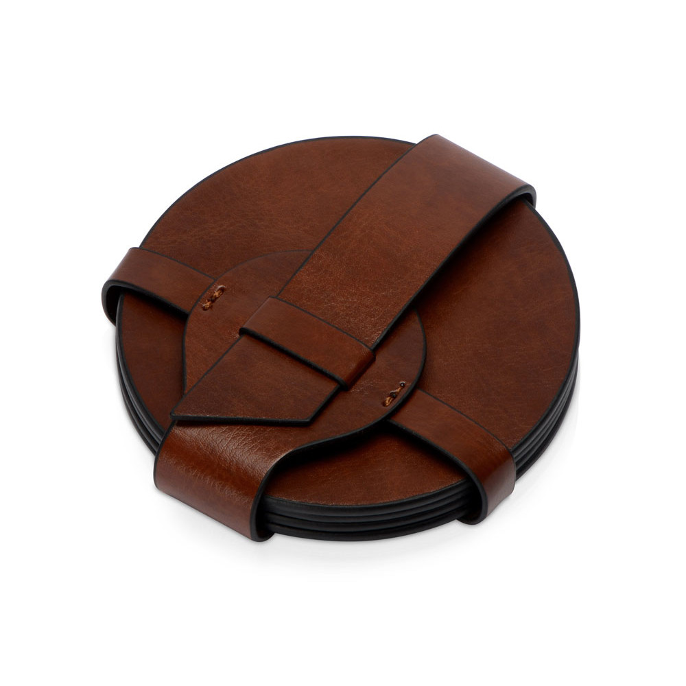 Набор состоит из четырех подставок и ремня-чехла, с помощью которого костеры очень удобно хранить в одном месте. Подставки круглой формы идеально подойдут для бокалов разного диаметра. Универсальная форма, легко моющийся материал, персонализация на самих костерах, а также ремешке.