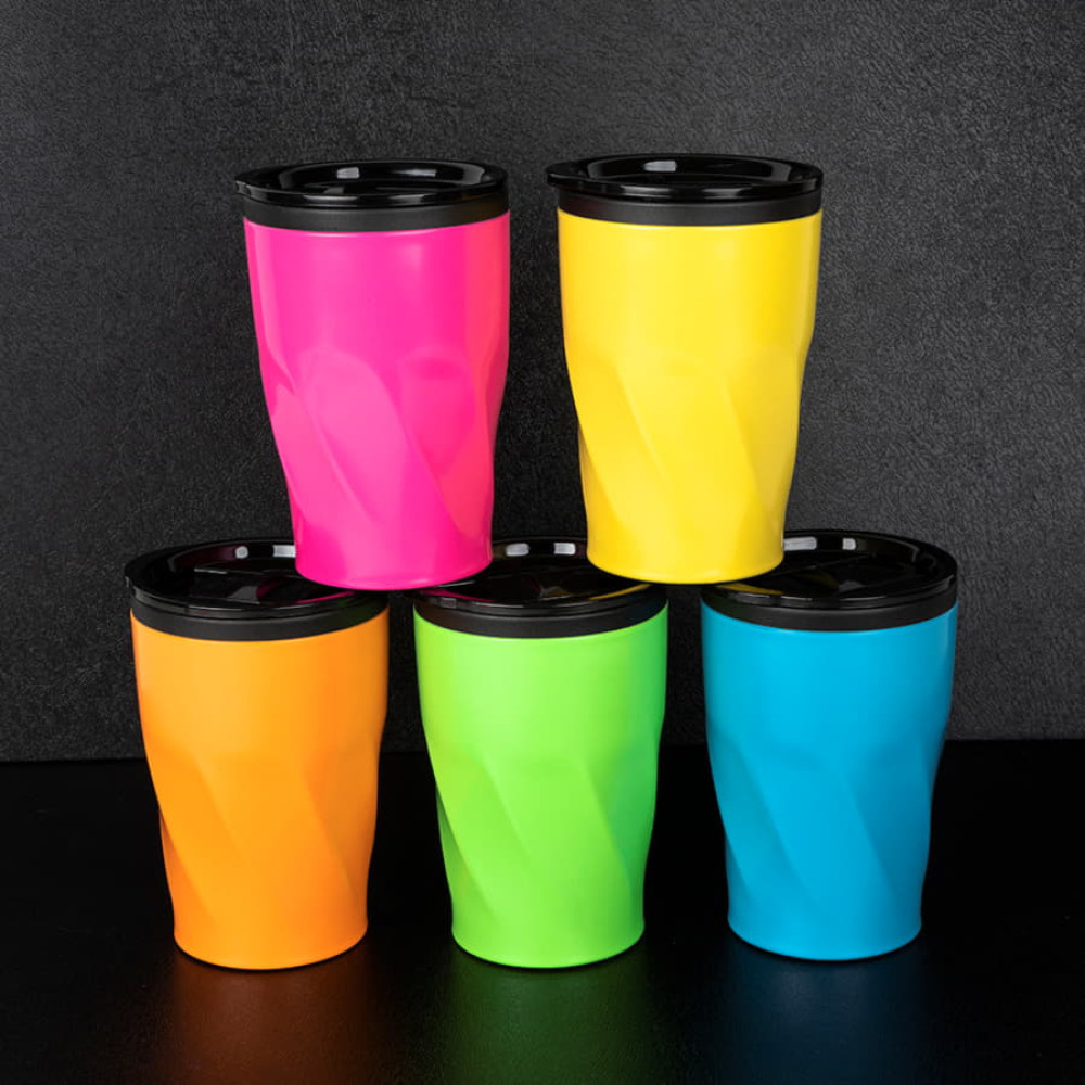 Коллекция дорожных промо-кружек NEON, отличается яркими матовыми цветами и оригинальной формой. Внимание: в этой модели колба выполнена из пищевого термоустойчивого пластика (PP). Внешние стенки стальные. Кружка не является вакуумной. Сохранит температуру горячих напитков - 1,5 часа, холодных 3 часа. ВНИМАНИЕ! Цена снижена из-за особенностей покрытия (см.фото).