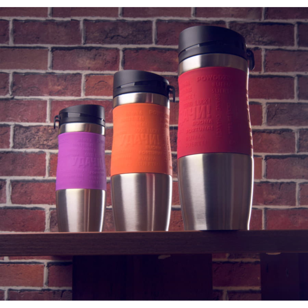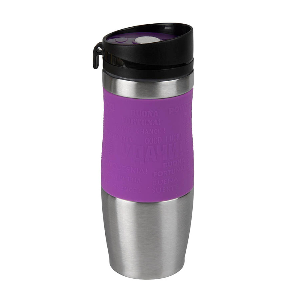 Удачи! Яркая термокружка с силиконовой манжетой. На манжете - пожелание"Удачи!" на разных языках. Pantone 2602C. Термокружки сделаны из 304 нержавеющей стали. Вы сможете сохранять ваши напитки горячими до 6 часов и холодными до 12 часов. Подходит для любых напитков. Можно использовать как для горячих, так и холодных. Как для безалкогольных, так и алкогольных. Благодаря уникальному покрытию и форме, кружка не выскальзывает из рук. Стильный дизайн и яркие сочные цвета. Это не просто обычная кружка, но еще и модный аксессуар