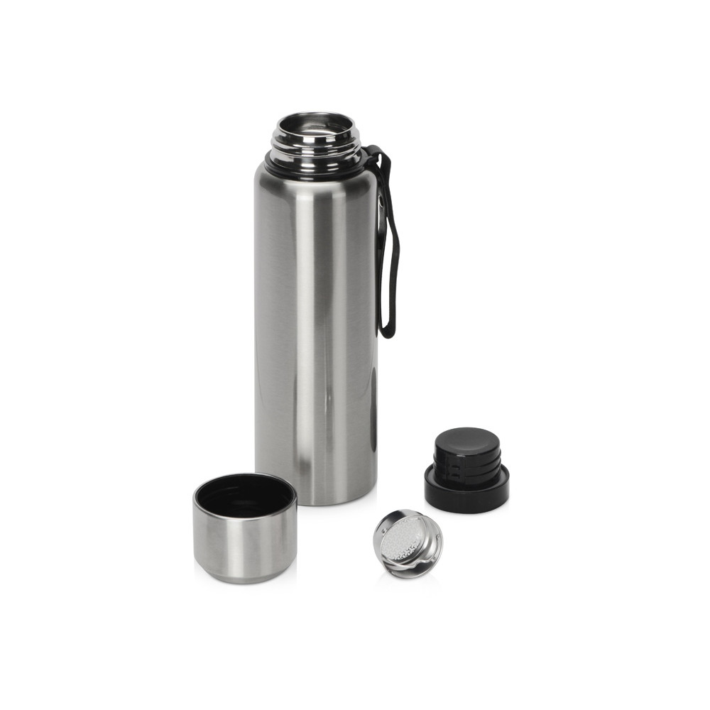 Вакуумный термос c двойными стенками из пищевой нержавеющей стали 304 марки для небольших путешествий и отдыха на природе. Надежно удерживает тепло и холод в течение 24 часов. Крышку можно использовать в качестве чашки. В комплекте имеется съемное ситечко из нержавеющей стали. Имеется прочный и удобный ремешок для переноски. Объем 800 мл.