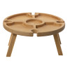 Деревянный столик на складных ножках может быть использован как во время пикников на открытом воздухе, так и дома, где его можно использовать прямо на полу. Столик позволяет подать 4 вида различных закусок, не смешивая их, благодаря четырем сепарированным секциям, в которые можно поместить ягоды, орехи и другие снеки, желательно, сухие либо подающиеся в масле (оливки, маслины). Четыре держателя для бокала особенно актуальны во время отдыха на природе, где каждый участник пикника обязательно оценит возможность зафиксировать посуду для вина.