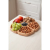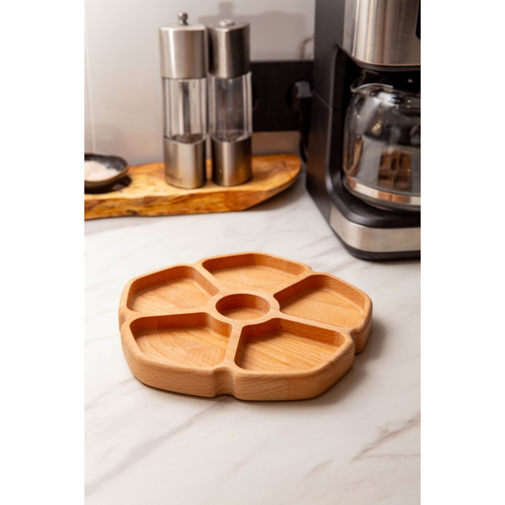 Менажница в форме цветка на 5 ячеек D=23см, выполнен из премиум материала бук. Материал отличается следующими преимуществами: Прочность - премиум материал дерева Бук Безопасность - обладает противомикробными свойствами, не вызывает аллергических реакций Простой в уходе - моется теплой водой, допускается использование средств для мытья посуды Экологичность - натуральное и безопасное сырьеУдобство - устойчив на любых плоских поверхностях, включая диваны и кровати