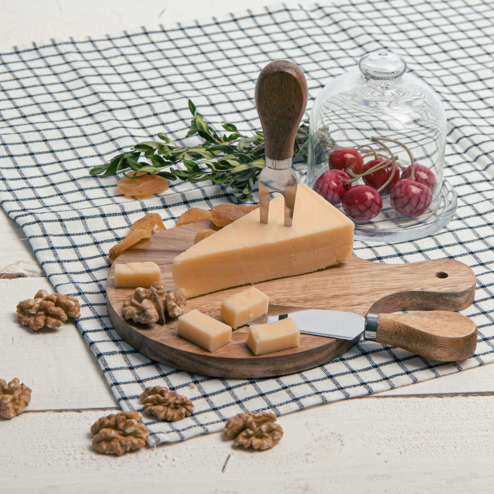 Набор для сыра: круглая доска с ручкой и два инструмента в комплекте - нож для мягкого сыра и вилка.
