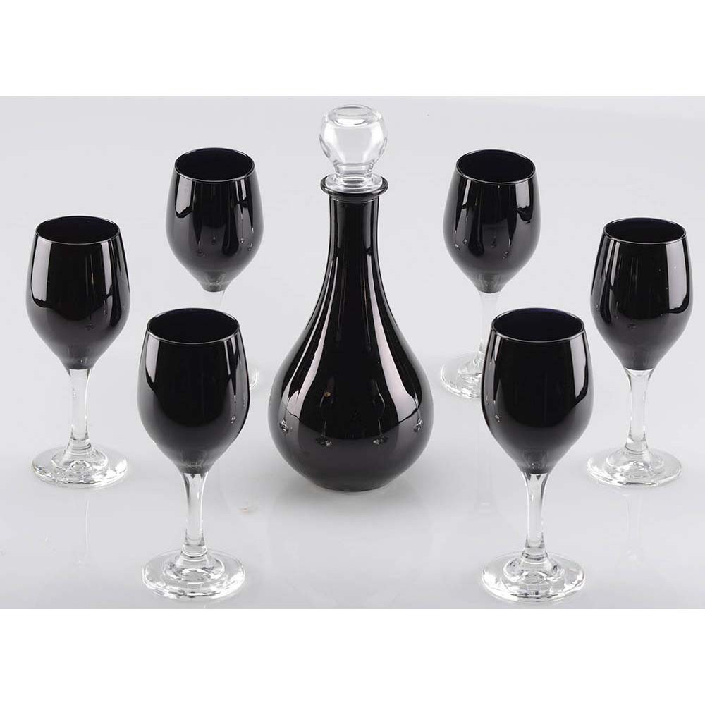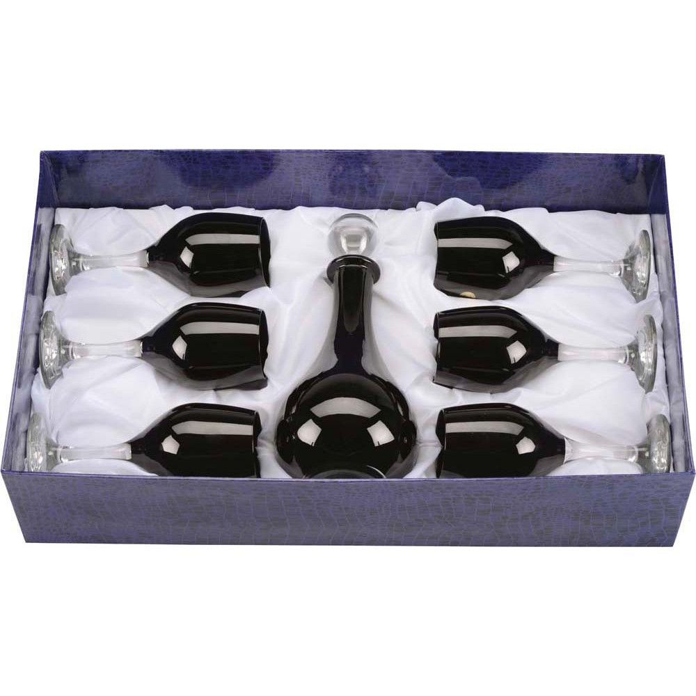 Подарочный набор посуды для вина включает в себя 6 бокалов и графин. Набор выполнен из тонкого прозрачного и черного стекла. Ручная работа. Плавность форм и изумительный внешний вид не оставит равнодушным даже самых требовательных людей.