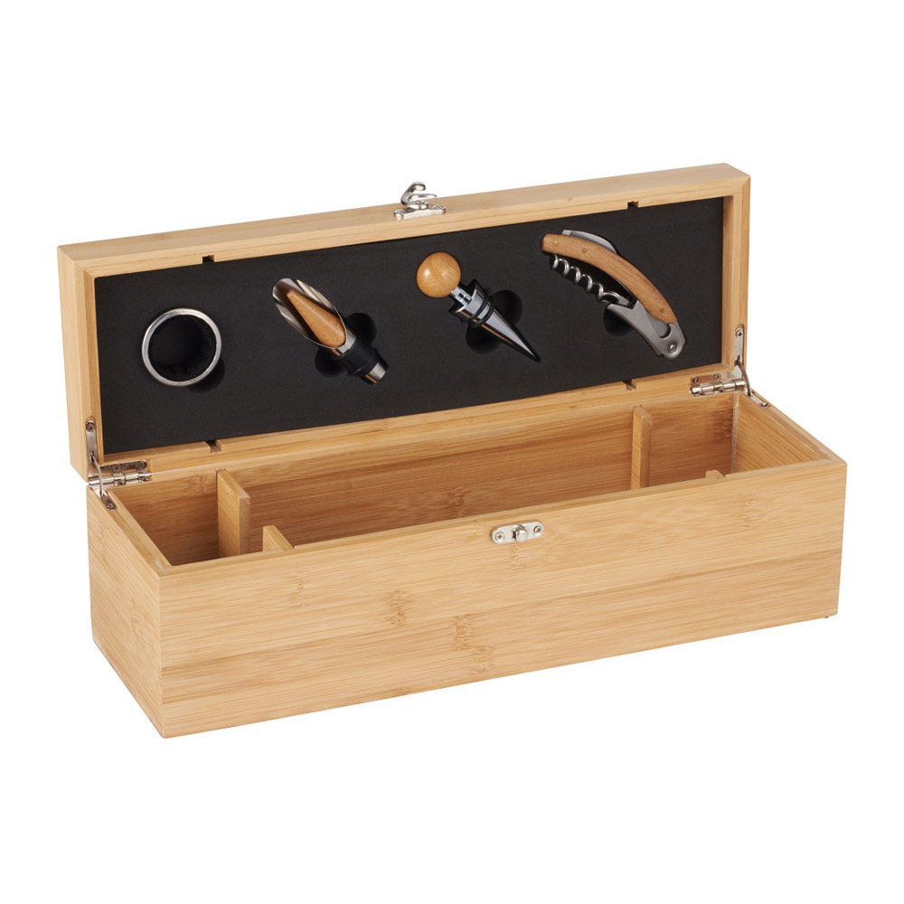 Набор Anniversary представляет собой прямоугольный бамбуковый футляр для бутылки вина, дополненный кольцом-каплеуловителем, пробкой, воронкой и штопором, которые украшены бамбуковыми вставками. Аксессуары располагаются в специальных гнездах, расположенных на крышке, благодаря чему их очень удобно хранить. Из-за особенностей бамбукового материала качество лазерной печати может отличаться.