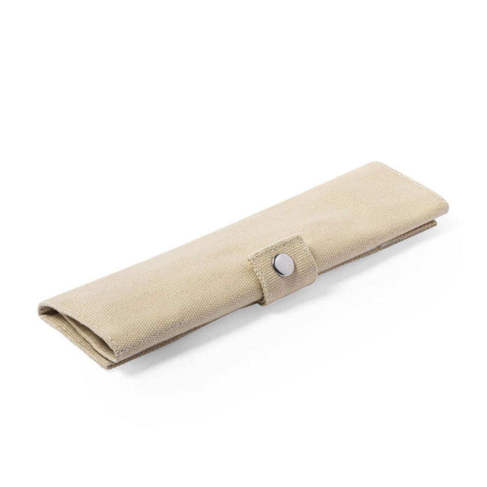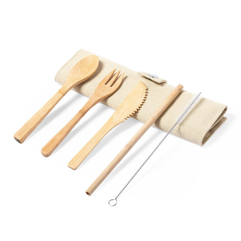 Набор из пяти предметов: ложка, вилка, нож, трубочка для питья с ершиком для чистки. Предметы убраны в холщовый чехол на кнопке и внутри закреплены резинкой. Такой набор удобно носить с собой, брать в дорогу или путешествие. Индивидуальная упаковка - ПЭ пакет