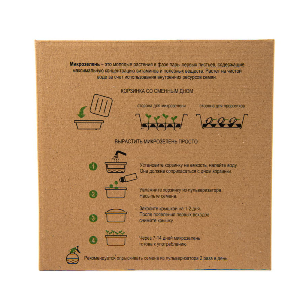 Микрозелень – молодые всходы растений в фазе первых двух листочков, содержащие максимальную концентрацию витаминов и полезных веществ. Растет на чистой воде за счет использования внутренних ресурсов семян. Комплектация набора: - крышка, - корзинка, - сменное дно, - емкость для жидкости. Проращиватель подходит как для крупных семян, так и для самых мелких. Для выращивания микрозелени установите сменное дно широкими бороздами вверх. Для проростков - широкими бороздами вниз.